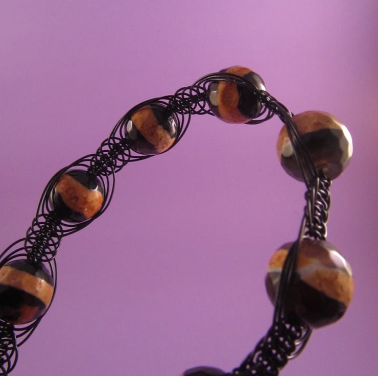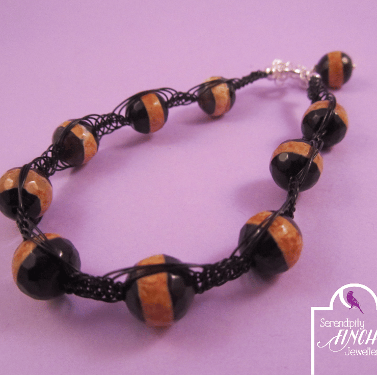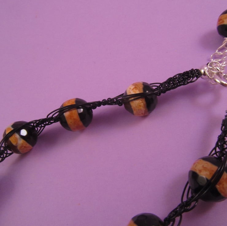 This is a great black and orange agate macramé bracelet. It is created using 56.41 cts of real faceted black and orange agate gemstones, beading wire and silver plated e-coated copper. This is ideal for casual wear, and those looking for subtlety in their jewellery.