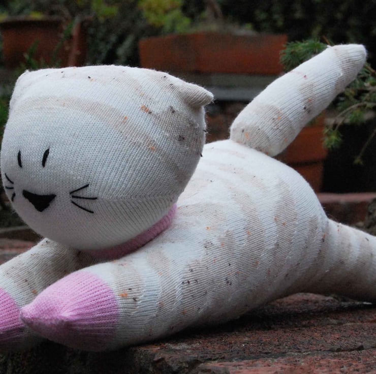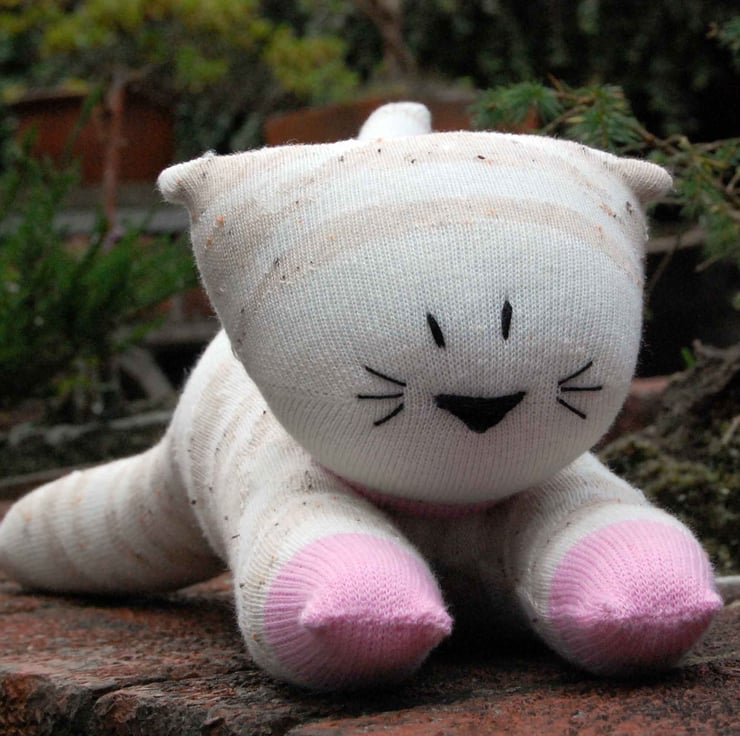 Pinky is a sweet and cuddly soft cat toy made from a brand new pair of patterned socks and filled with polyester fibrefill conforming to EN71. All sock toys are now CE marked and comply with European standards.