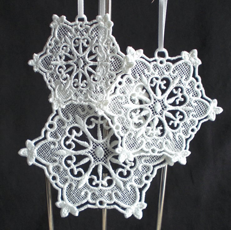 Set of 3 embroidered snowflakes in a brilliant white thread, hanging on white satin ribbon.