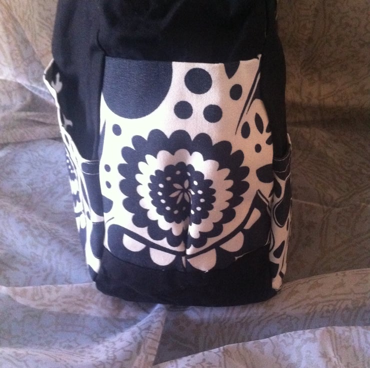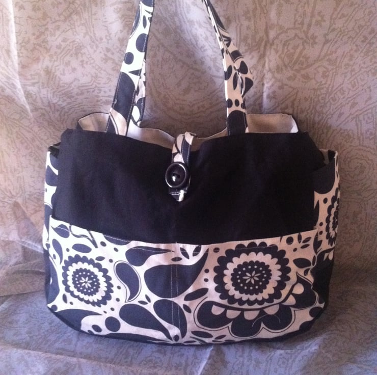 Lovely spacious black and white handbag. Quality cotton fabric, polyester lining. Inner pocket for mobile phone. Six outer pockets (2 side pockets and two front and back pockets.