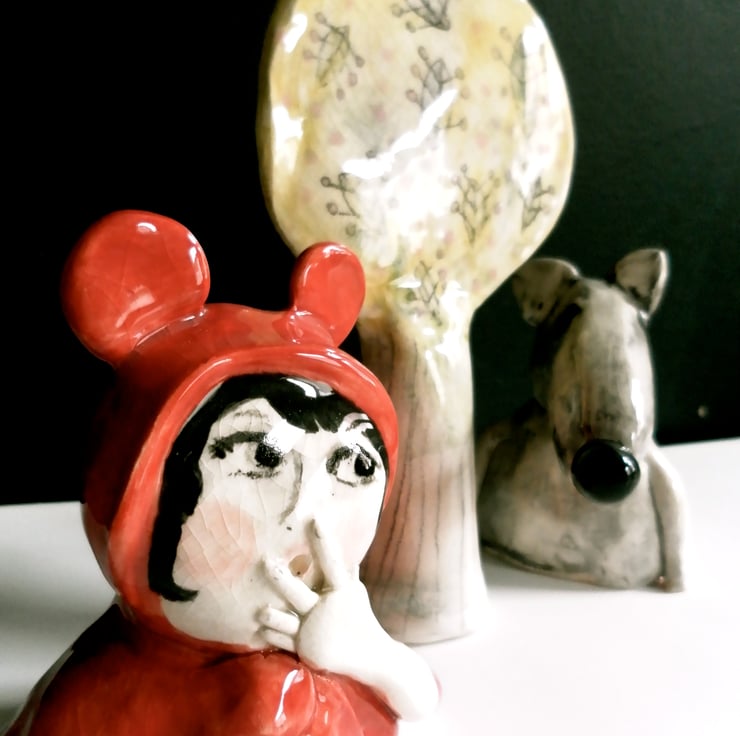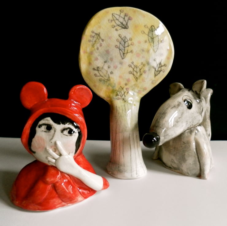 Hand made sculptural story illustrational ceramic character set. Eathenware,hand decorated, glazed Trio. This would look great on a bookcase next to the book which alas I havent got, as it wood look great in the photo.