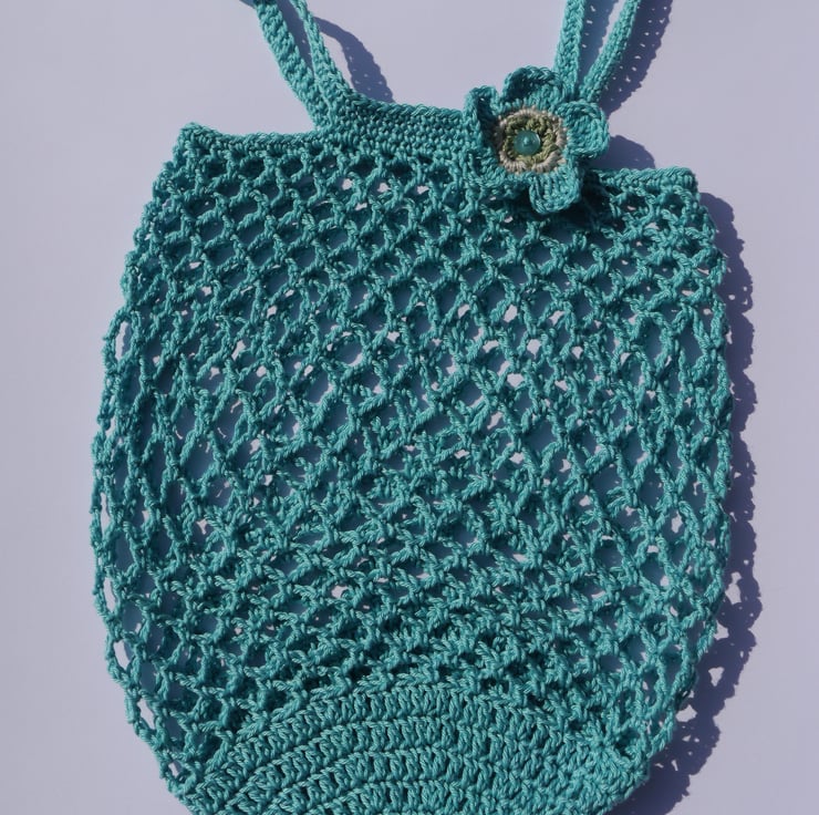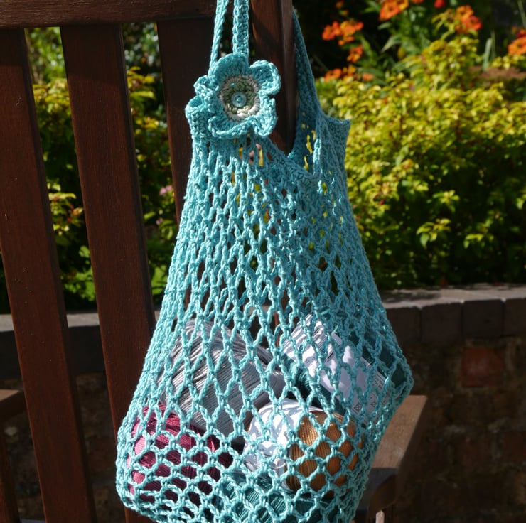Useful little hand crocheted cotton market bag with pretty flower embellishment. Just pop it in your handbag, car or under the pushchair and never forget a shopping bag again. It measures approx 30 cm wide by 32cm long when laid out flat but will expand generously when filled with goodies. Also useful for putting your knitting/crocheting projects in or even in a child's bedroom for soft toys etc.