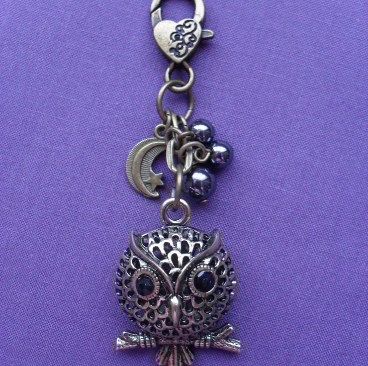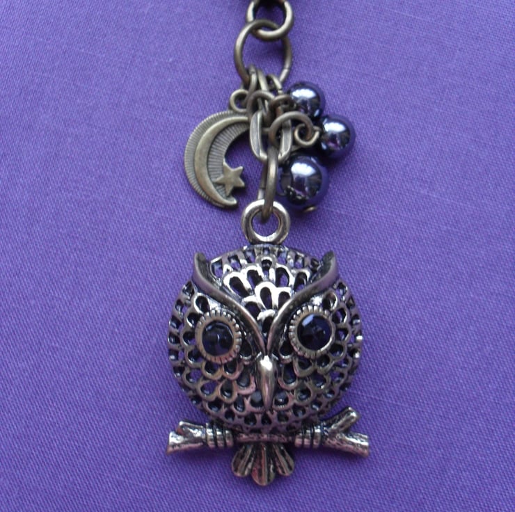 3D Bronze tone owl with a moon and star charm and semi precious gemstone beads of haematite are attached to a bronze tone chain and clasp