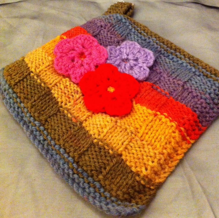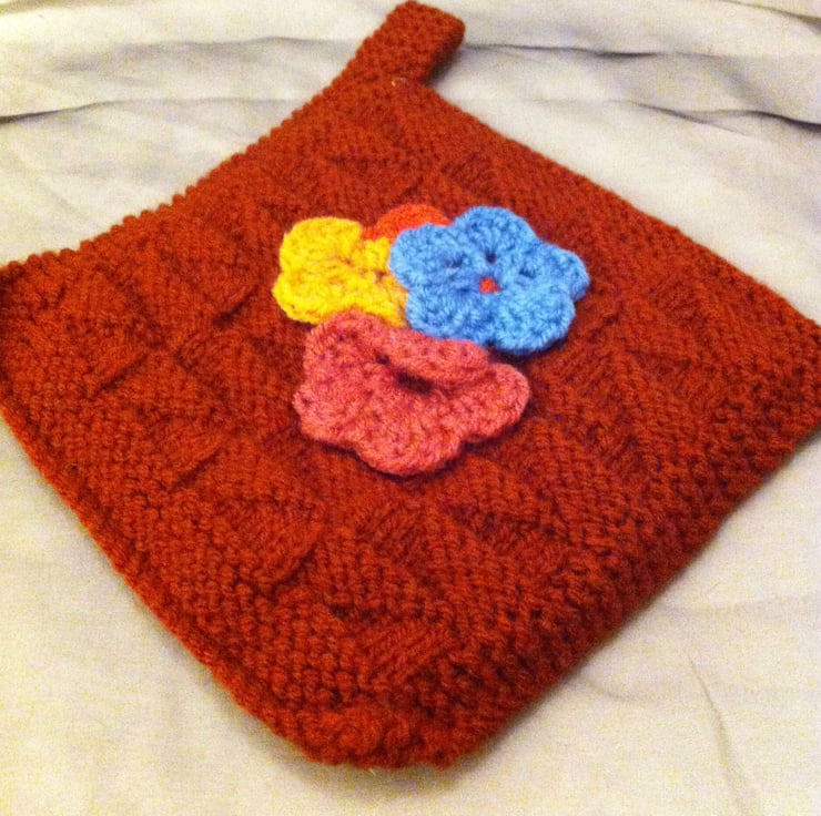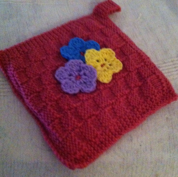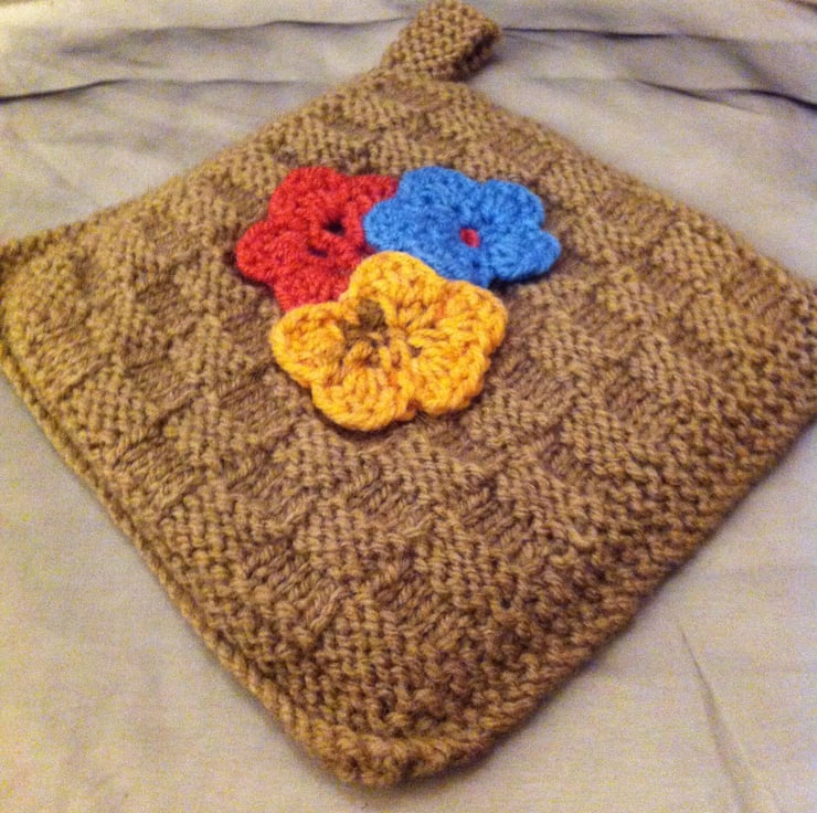 Little decorative square knitted pot holder with flower decoration and handle. Item is padded and has a decorative cotton base. Machine washable, do let us know which you would like.