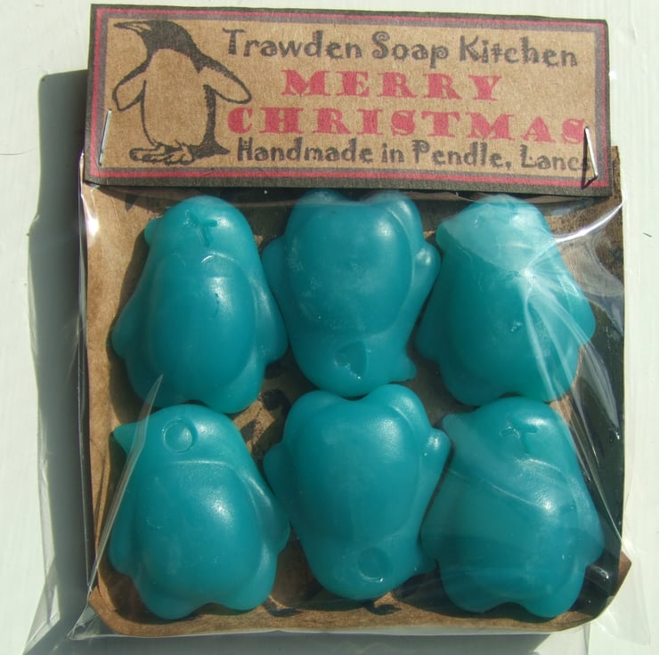 Cute pack (80g) of 6 Penguin Shaped Soaps with minty fresh peppermint essential oil. Pack can be customised with names & personal festive message