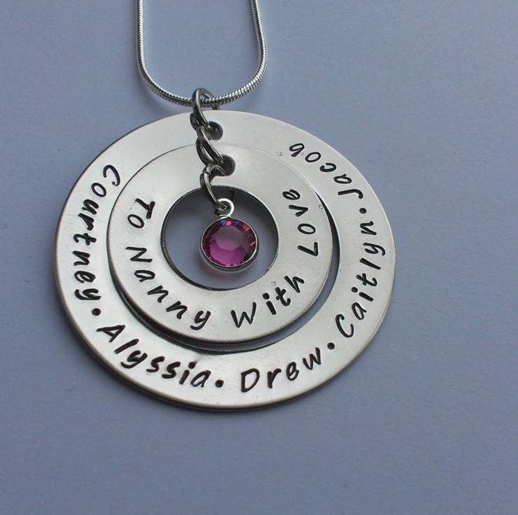 In the notes to seller during checkout please include the text you would like stamped and which should be on the inside and which on the outside washer, and which birthstones you would like. All of my items are customisable so please contact me if you have any design in mind. Thanks!