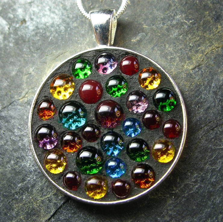 Delicious looking multi coloured handmade glass beads set in a silver plated pendant tray.