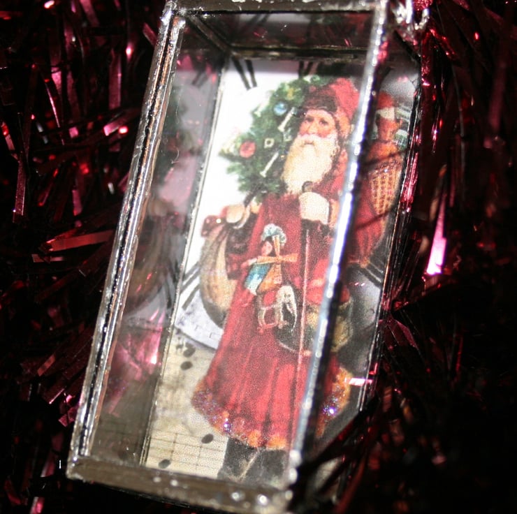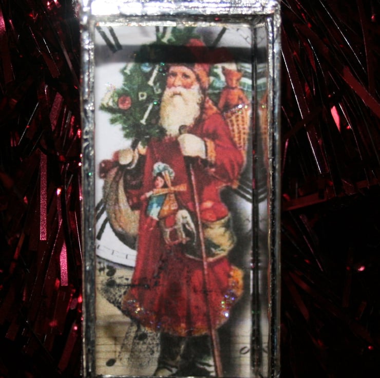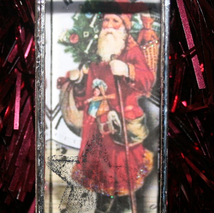 Inside the glass is a small image of Santa carrying a glittered Xmas tree and a bag of toys, also a clock face and a sheet of music.