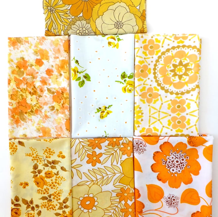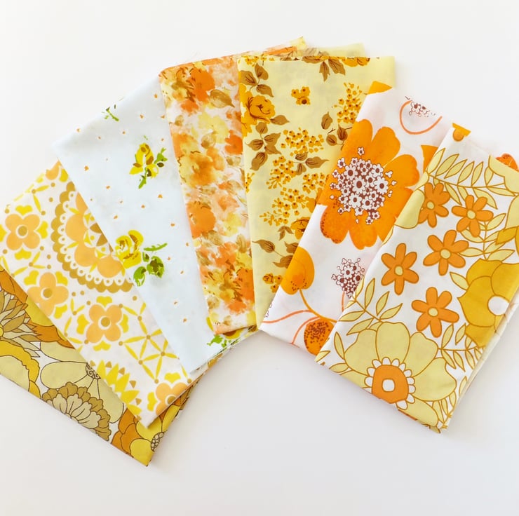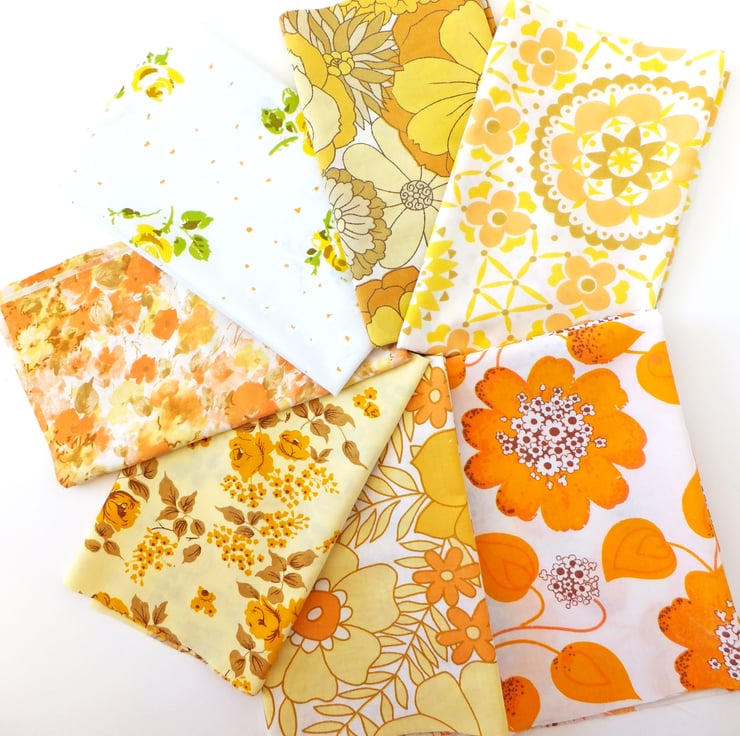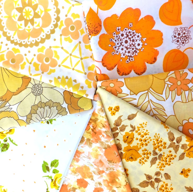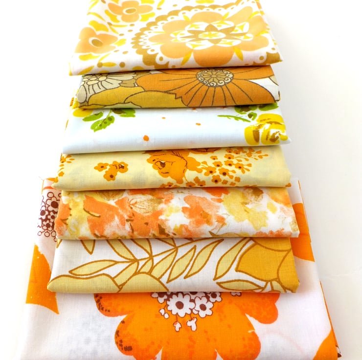 A lovely vintage fabric fat quarter bundle in oranges and lemons - seven bright retro florals and patterns. This bundle contains 7 fat quarters from vintage sheet fabrics. This fabric would be perfect for quilting, cushion making and all sorts of fabulous craft and sewing projects.
