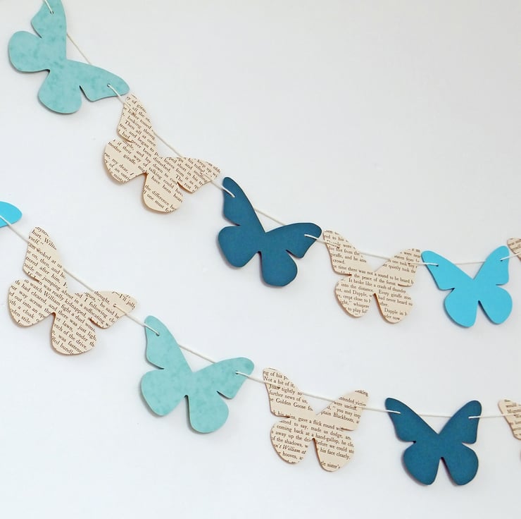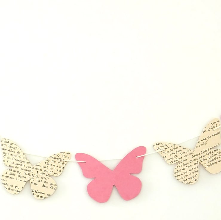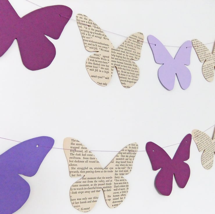 This listing is for ONE garland of bunting with 7 hand-cut butterflies - 4 are made from a vintage book and 3 are in different shades of lilac and purple. The butterflies measure 14 cm at their widest point so if they were laid end to end on the yarn they would stretch 98 cm (approximately 3 feet 2 in). I have threaded the butterflies onto beading thread or yarn with extra so that you can space the butterflies out if you wish. Your butterflies may be very slightly different from those in the photos but will be equally lovely!