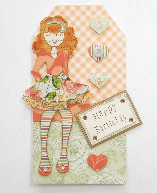 This is a handmade paper doll card, her outfit is co-ordinated and cut to fit from a range of papers. She is mounted onto cream card stock and has a cream envelope with cello wrap.