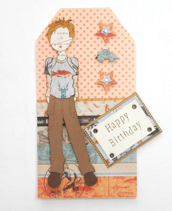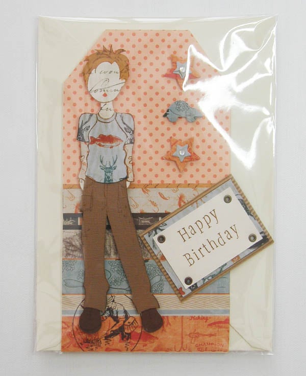 This is a handmade paper doll card, his outfit is co-ordinated and cut to fit from a range of papers. He is mounted onto cream card stock and has a cream envelope with cello wrap.