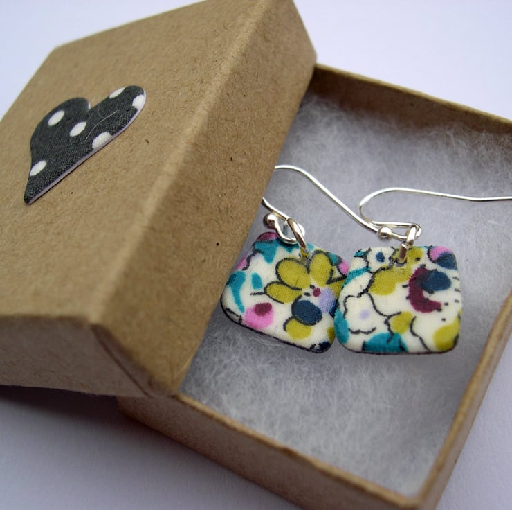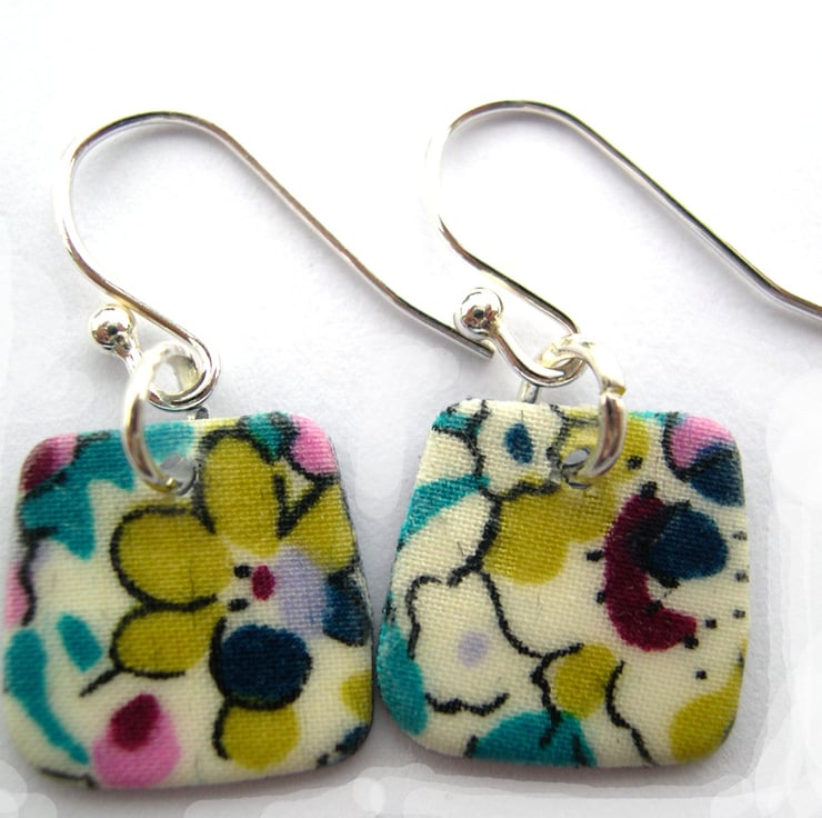 These beautiful and unique earrings and have been created from offcuts of a Liberty of London Print Fabric which have been hardened and cut to a Square shape and set upon 925 sterling silver wires.