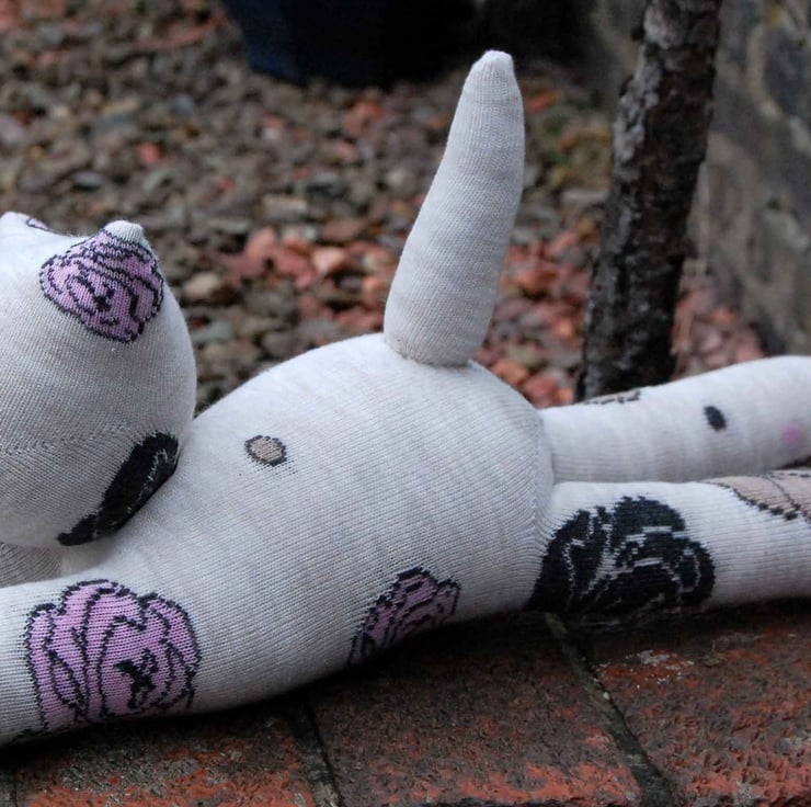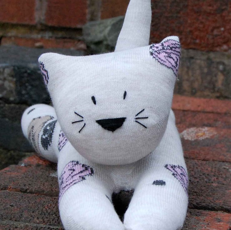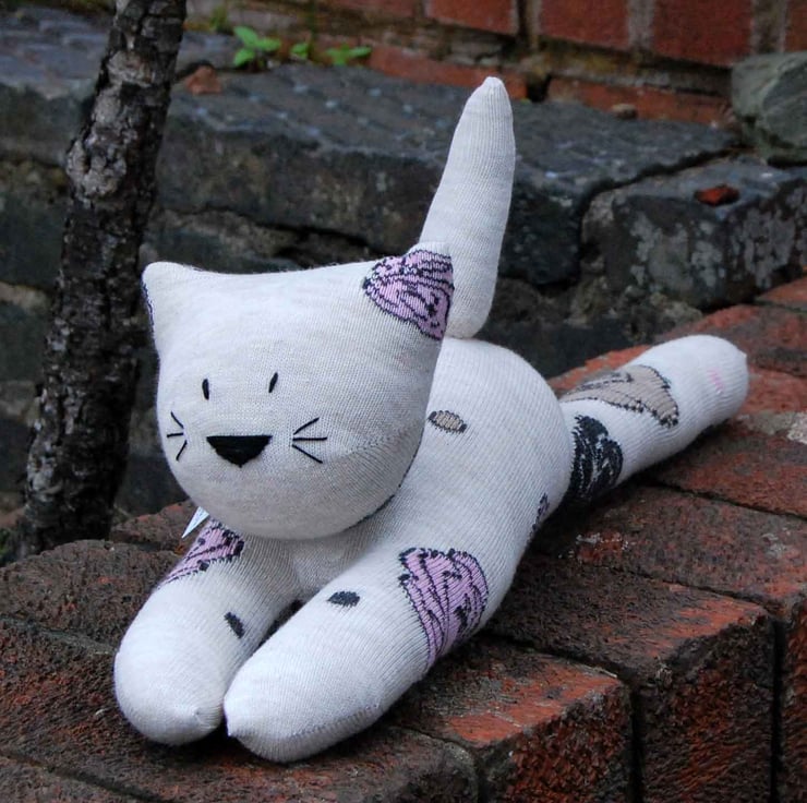 Rosa is a sweet and cuddly soft cat toy made from a brand new pair of patterned socks and filled with polyester fibrefill conforming to EN71. All sock toys are now CE marked and comply with European standards.