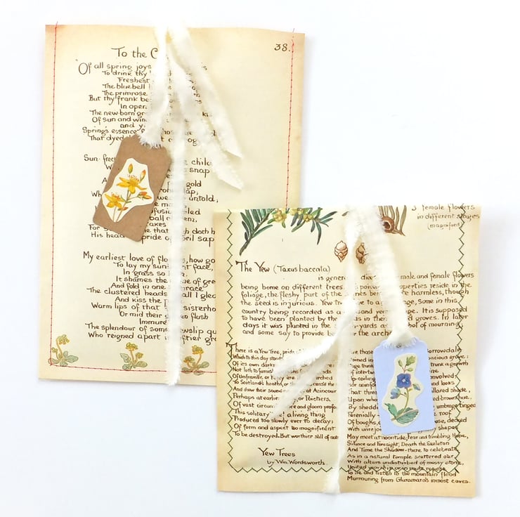 The gift bags have been up-cycled from the Country Diary of an Edwardian Lady by Edith Holden and are sewn with a pastel pink cotton thread. You receive 3 bags and 3 gift tags - one in Kraft card and the others in pastel blue and lilac - decorated with a small pretty picture taken from the Country Diary. You also receive cream frayed fabric ribbon to allow you to tie up the bags if you wish (the first photo shows you how these bags can look in use).