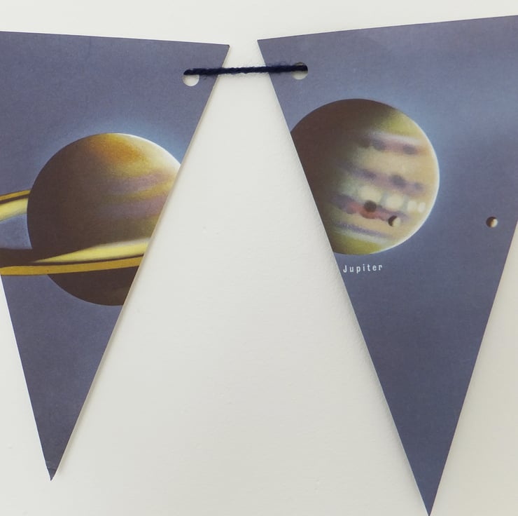 This lovely paper garland has been up-cycled from a vintage atlas showing the sun and planets. Your bunting may be slightly different from the one in the photos but will have an equally lovely selection of sun and planet flags.