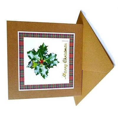 The colour photograph of holly with its berries & a sprig of ivy was taken close to where I live & is printed on glossy photographic paper that is backed by a red tartan card border. The ‘Merry Christmas’ embellishment greeting on the front of the card is in gold, while inside there is a blank insert with a tartan border for you to write your own greeting.