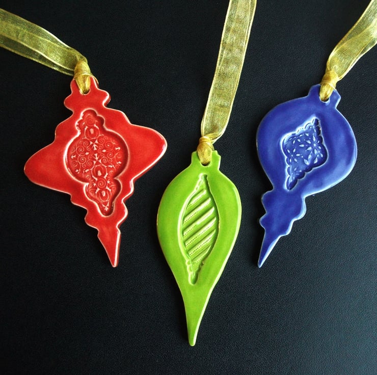 This highly decorative set of three Christmas decorations are made from white earthenware clay and decorated with bright, bold pattern.