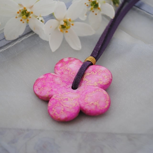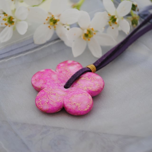Lovely pink ceramic daisy necklace. The pink daisy has gold tones and is approximately 3 cm in length. The daisy is hung on a purple faux suede necklace which is finished with copper cord ends and a matching copper lobster clasp.