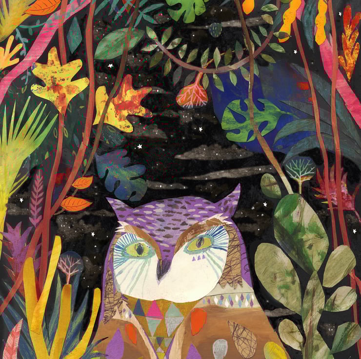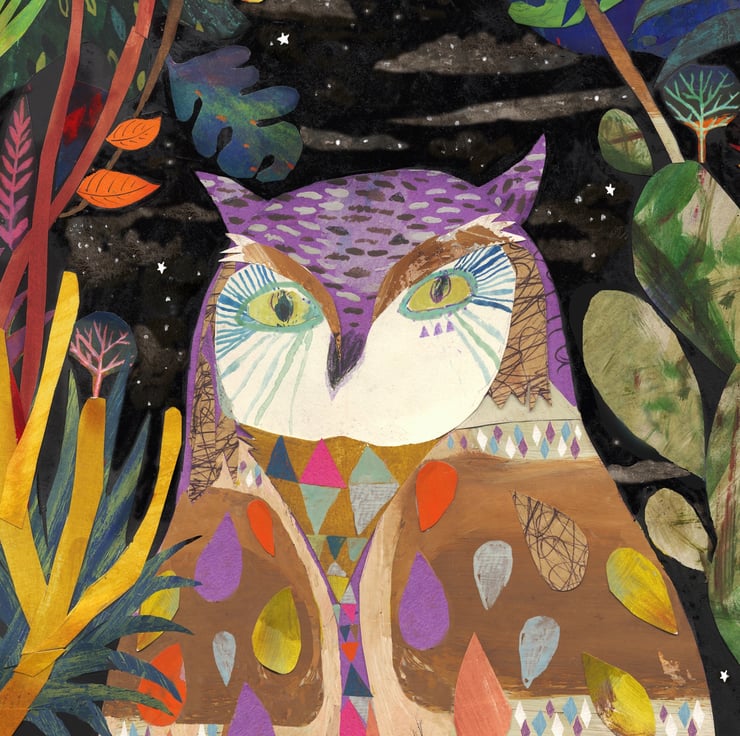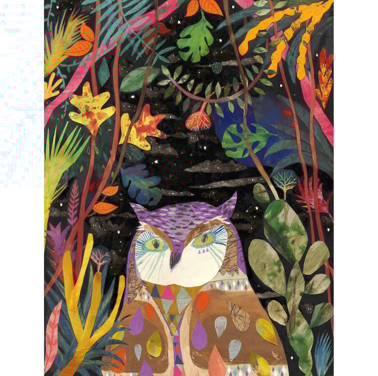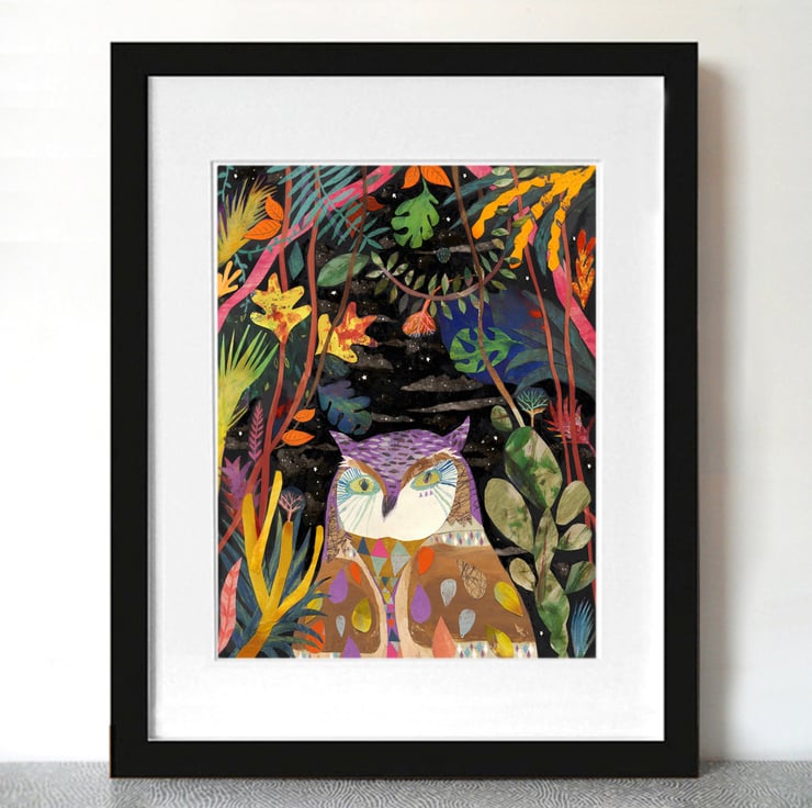 Here is an A3 Print (11.69 in x 16.54 in)of an original mixed media collage An Owl in the Jungle