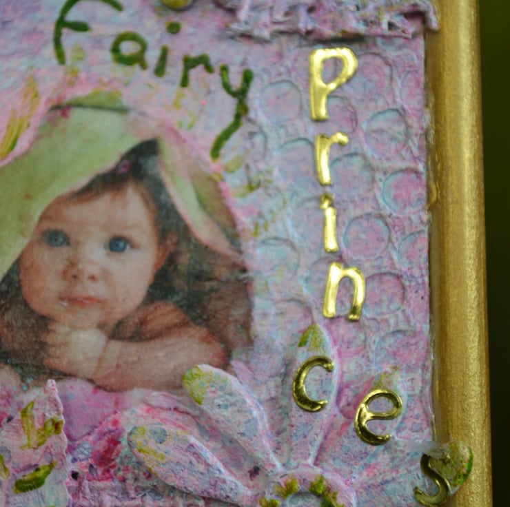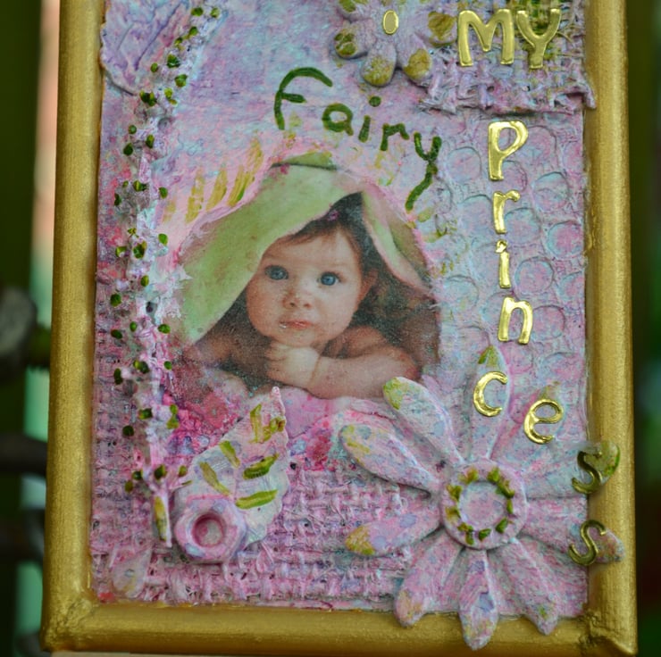 This listing is for a custom designed photo collage of your special princess. This can be customised to your personal requirements giving you a choice of colours, elements used and the overall theme. It can also be customised for a "My little dude" photo. This is an ACEO canvas that has had a number of different elements glued on, which is then given an overall neutral coat and your personal photo is then decopaged on. Colour and finish is then added and finished off with a gold frame.