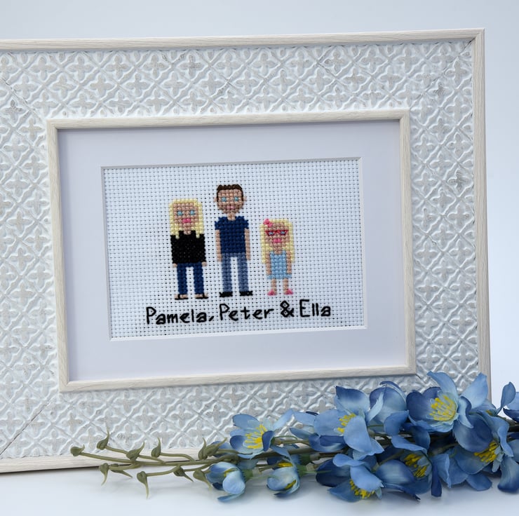 This listing is for a three people/pet portrait. It will be supplied as a 6x4" cross stitch in an 8x6" mount which can then be framed. FRAME IS FOR ILLUSTRATIVE PURPOSES ONLY AND IS NOT INCLUDED. I do not include a frame to keep delivery costs down. You can pick up some beautiful frames for the price that I would have to charge for delivery, so I think it's only fair!