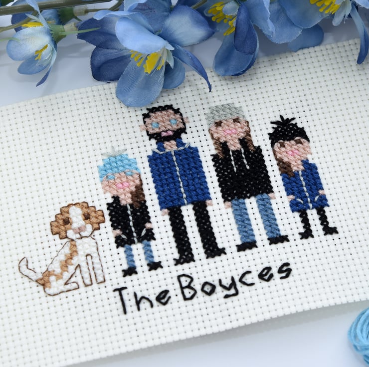 This listing is for a four people/pet portrait. It will be supplied as a 6x4" cross stitch in an 8x6" mount which can then be framed. FRAME IS FOR ILLUSTRATIVE PURPOSES ONLY AND IS NOT INCLUDED. I do not include a frame to keep delivery costs down. You can pick up some beautiful frames for the price that I would have to charge for delivery, so I think it's only fair!