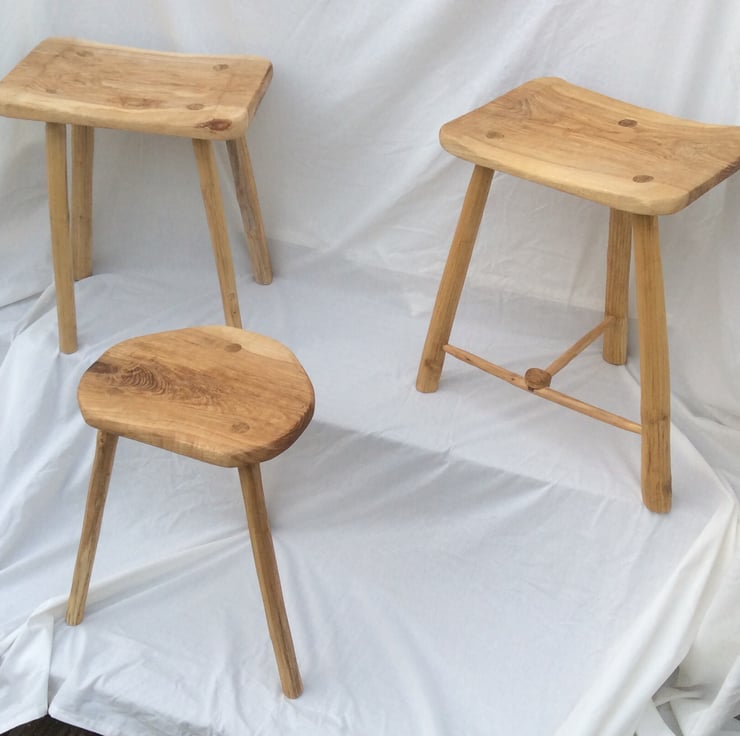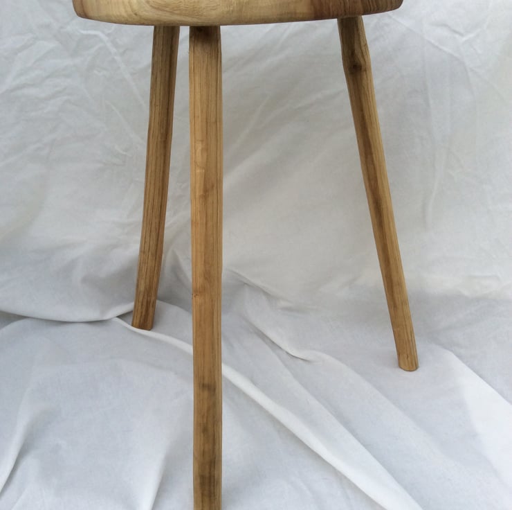 A unique ash stool made with hand tools using traditional green woodwork techniques: the legs were made using a drawknife and the seat was shaped with a hand adze.
