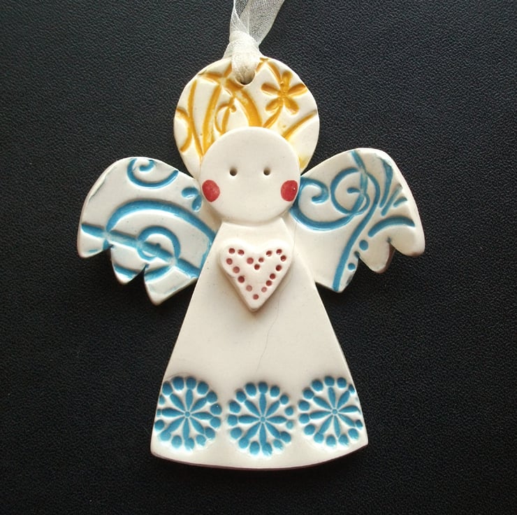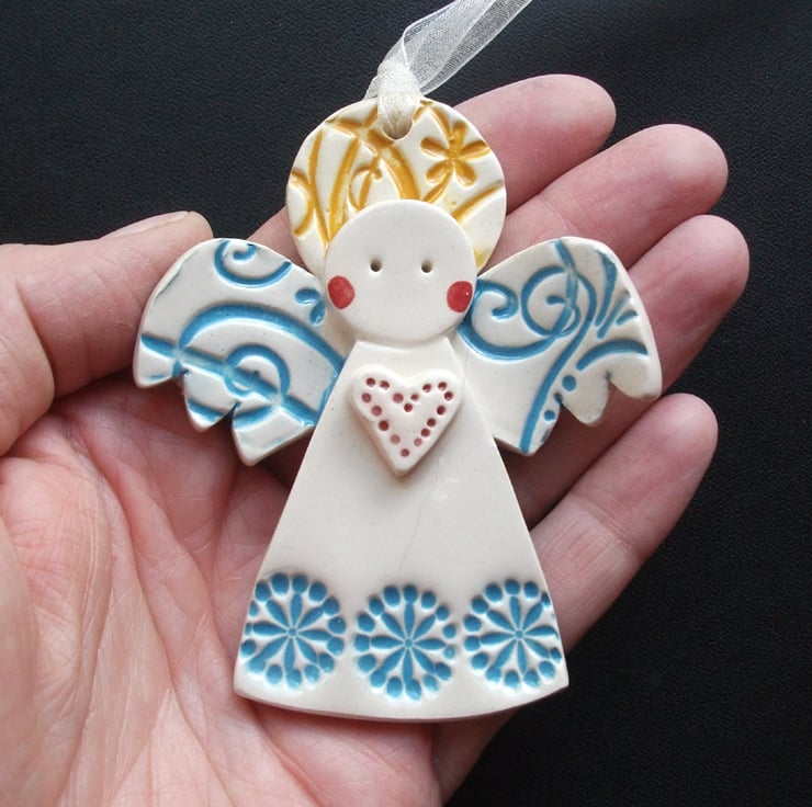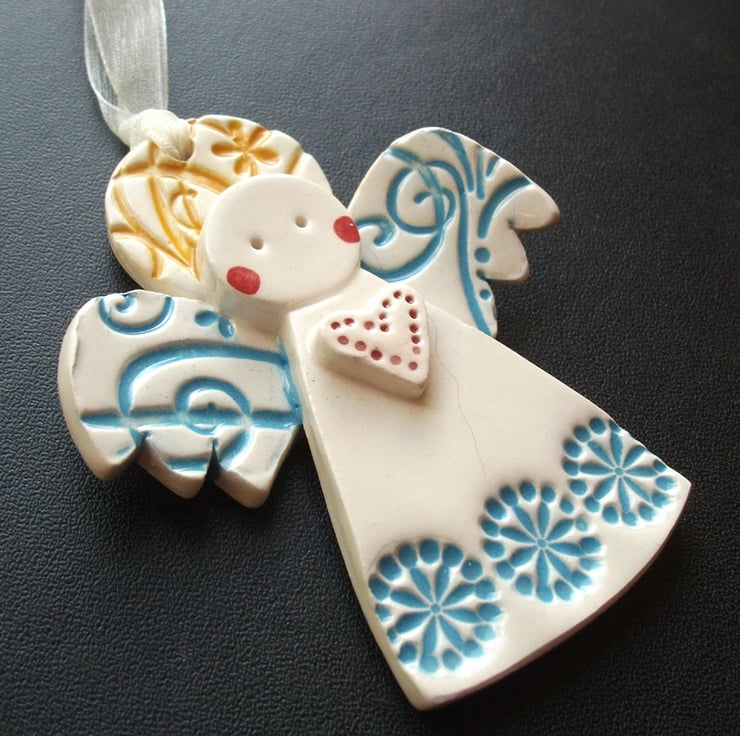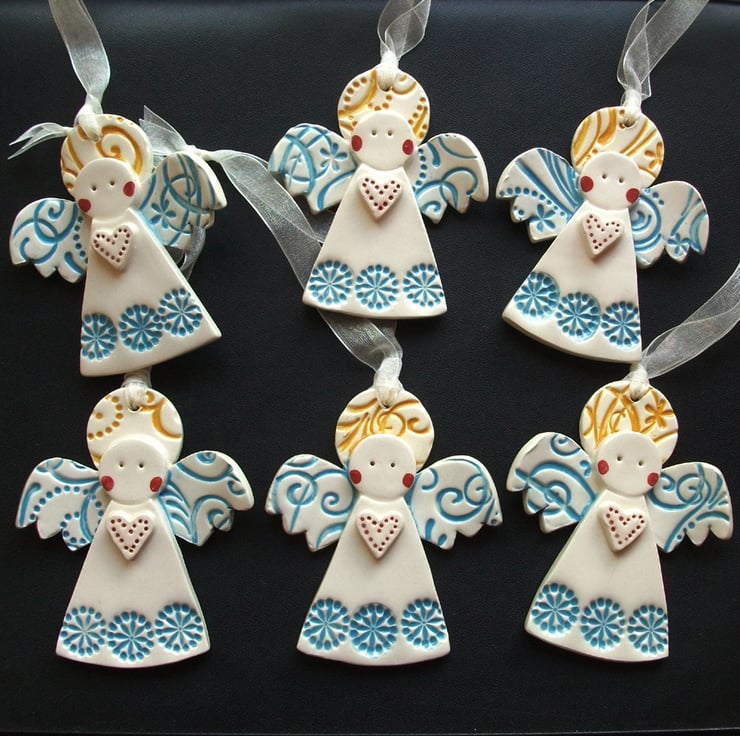 These cute little angels are made from white earthenware clay and decorated with coloured slips and glazes.