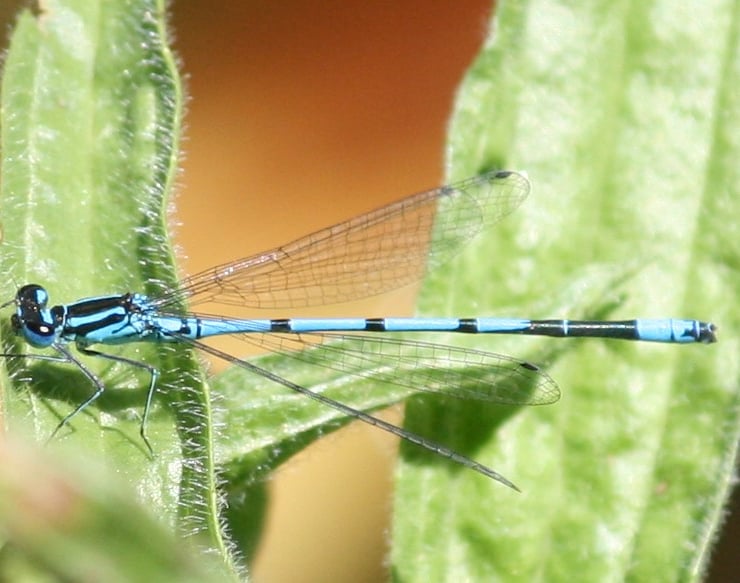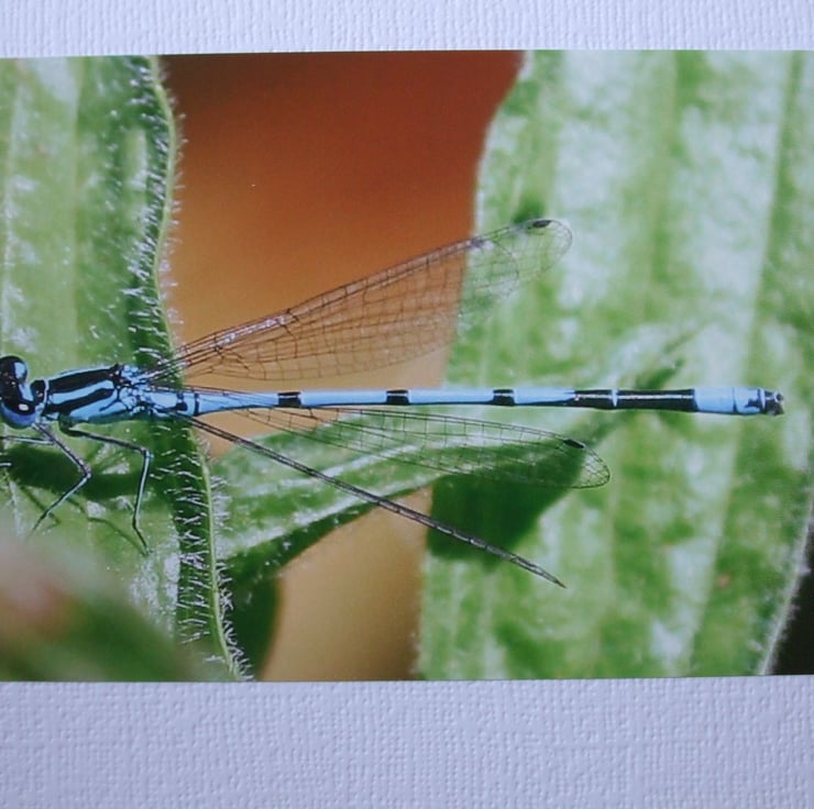 Photo ( 6" x 4" ) of a Damsel Fly on a leaf, mounted landscape on white textured card,with a plain inner, left blank for your own personal message. An envelope is also included.