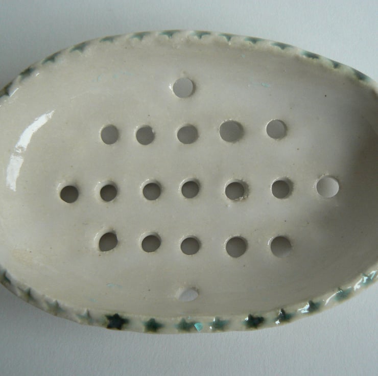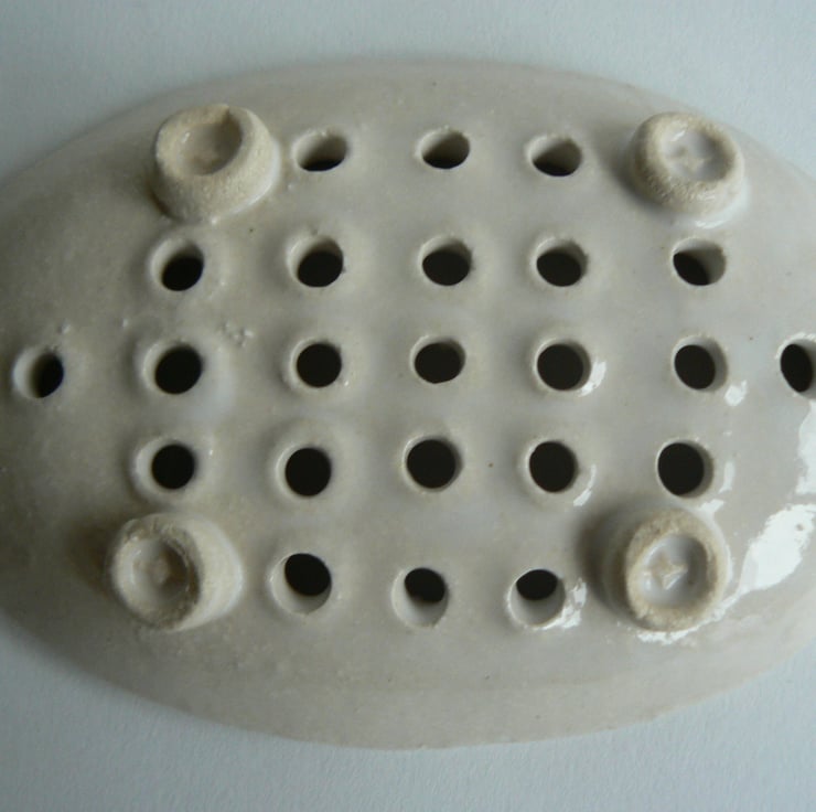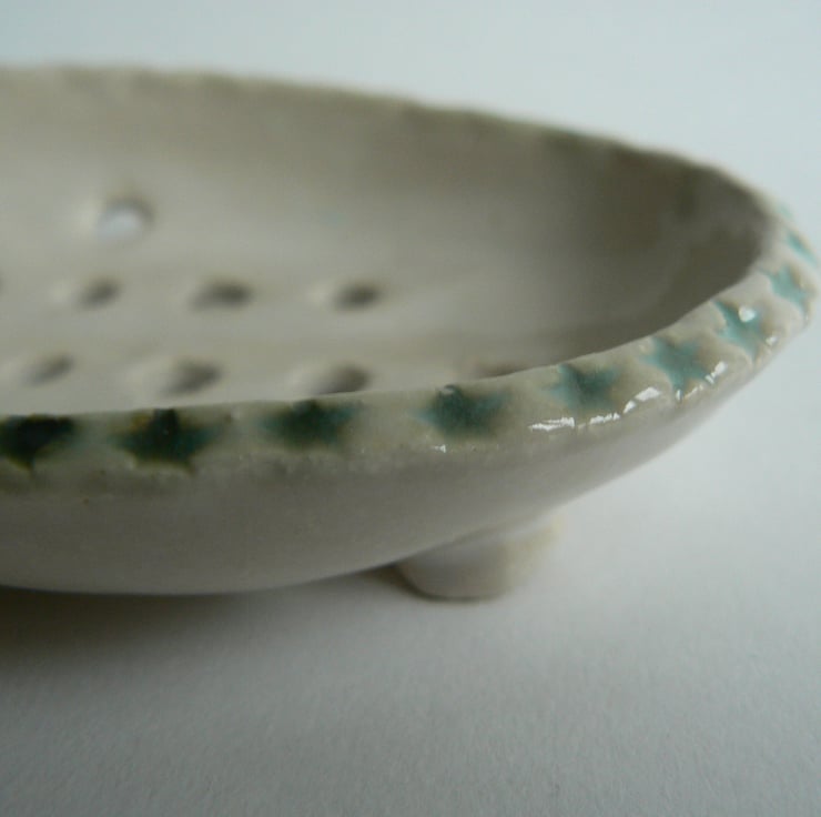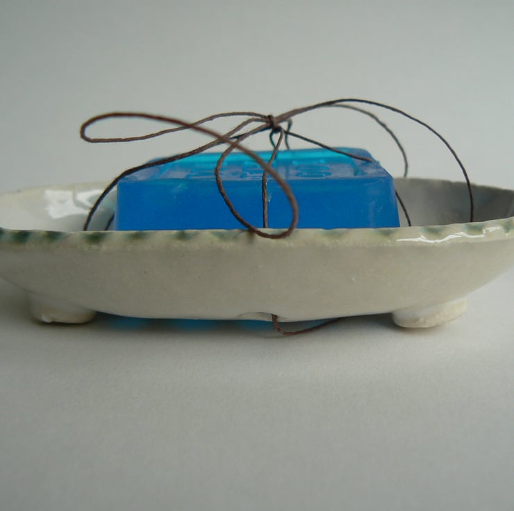 A stoneware fired soap dish. Featuring a small amount of applied decoration and glazed in a shiny white. The glaze completely cover the dish apart from the bottom of the feet to make it easy to keep clean.