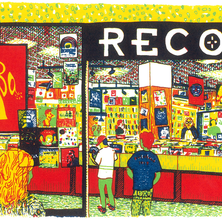 This is a re-print is of an artwork by Leeds based illustrator Simon Lewis. It was originally a screenprint which I did in early 2014, it's a much loved independent record store in central Leeds with a great selection of music and clientele. This is what I tried to capture with this image with a variety of posters, album covers and customers