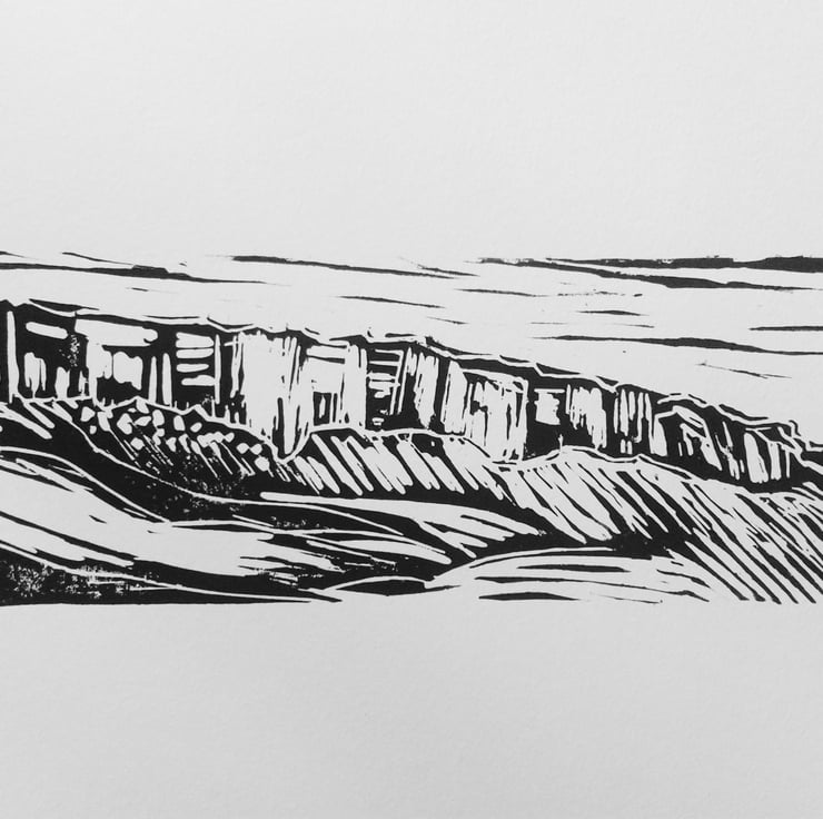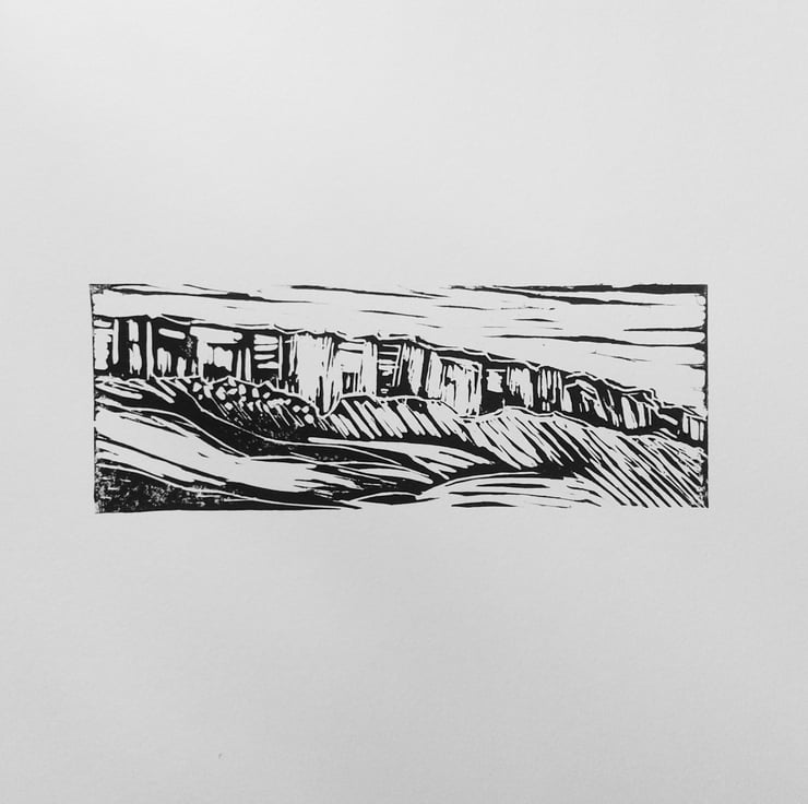 A hand-cut, linoprint of Stanage Edge, favoured by climbers, near Hathersage, Derbyshire Peak District. Printed in water soluble black ink on 200gsm paper. Each print is hand printed and unique. Limited run of 20, signed in pencil below. A great Christmas gift for a climber.