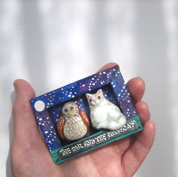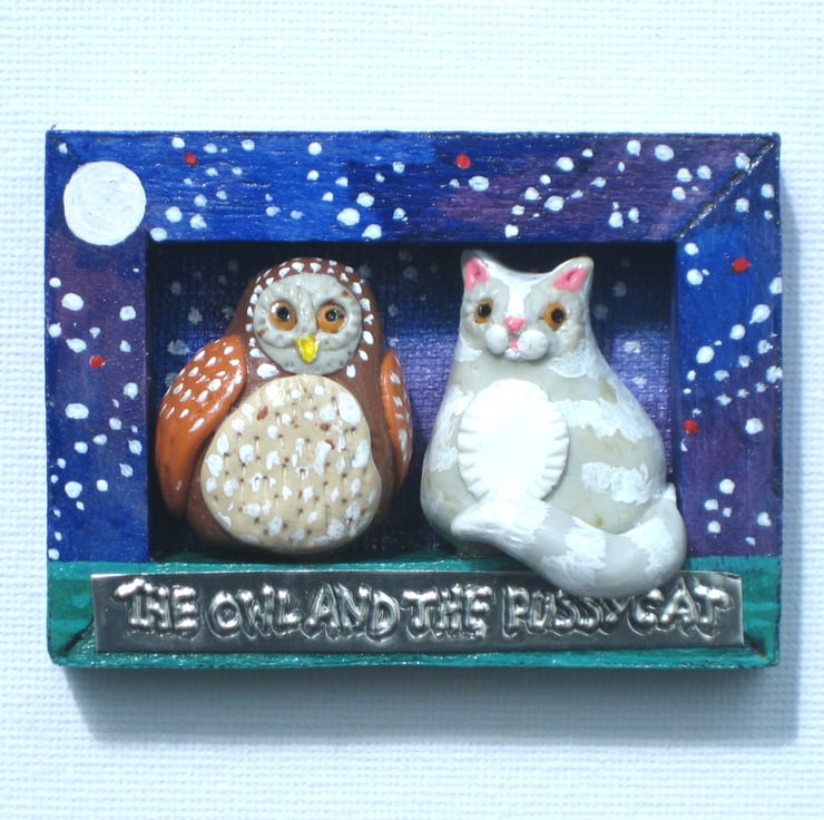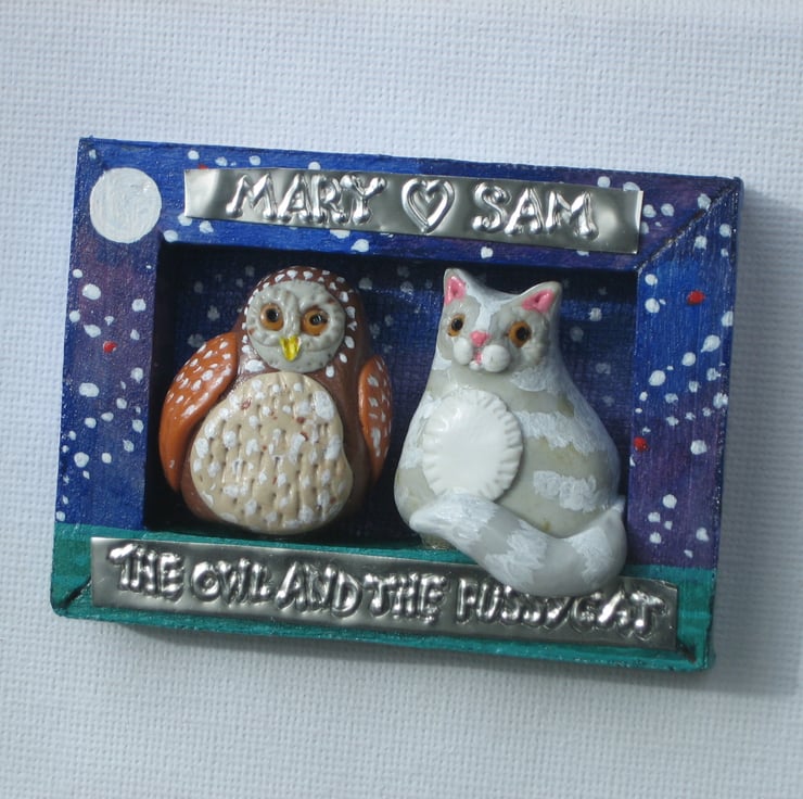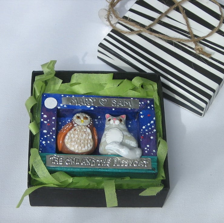 Modelled in polymer clay and painted in acrylics and varnish, these two little characters have been placed in a starry scene from Edward Lear's famous rhyme. The frame has been painted in acrylics and finished with a banner of pewter. Measuring just 72mm x 52mm, it can be stood on a shelf or attached with Blu-tack to a vertical surface. Can be personalised with a pewter banner for no extra charge. A unique gift to send good wishes for any special occasion. Gift boxed.