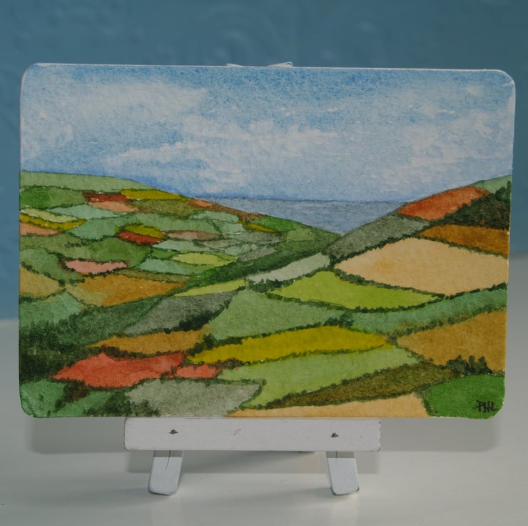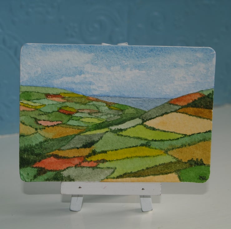 This ACEO is an original, hand painted watercolour interpretation of a patchwork landscape, with fields of ochre, russet and a myriad of greens looking out to the sea beyond. It measures 2.5 x 3.5 inches (63 x 89mm).