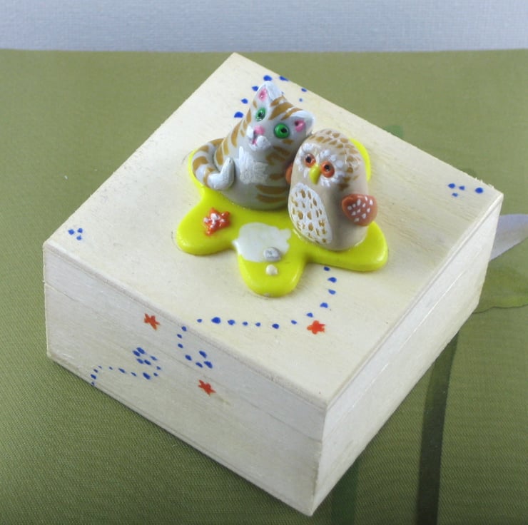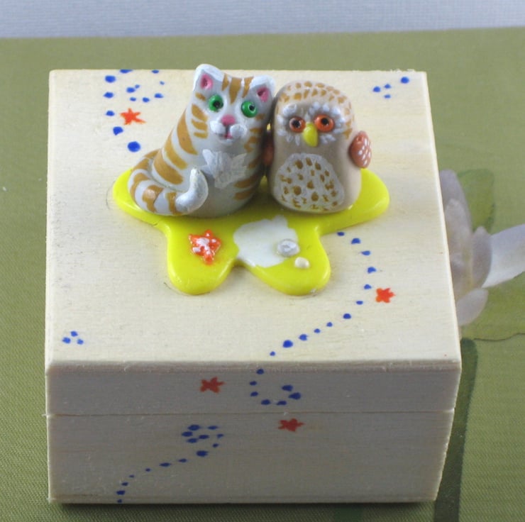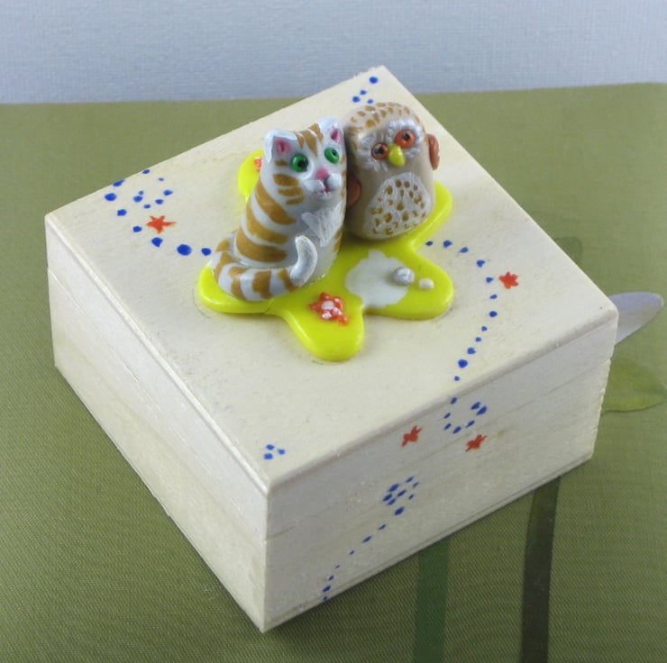 This little wooden box has been decorated with a scene from Edward Lear's famous rhyme, modelled in polymer clay. It has been finished with acrylic paint and varnish. Measuring 6cm square x 34mm high, it is perfect for small trinkets and treasures. The box is hinged and has a magnetic closure. Not recommended for children under 3.