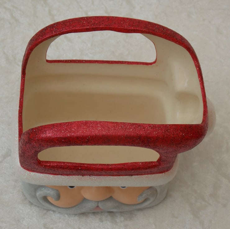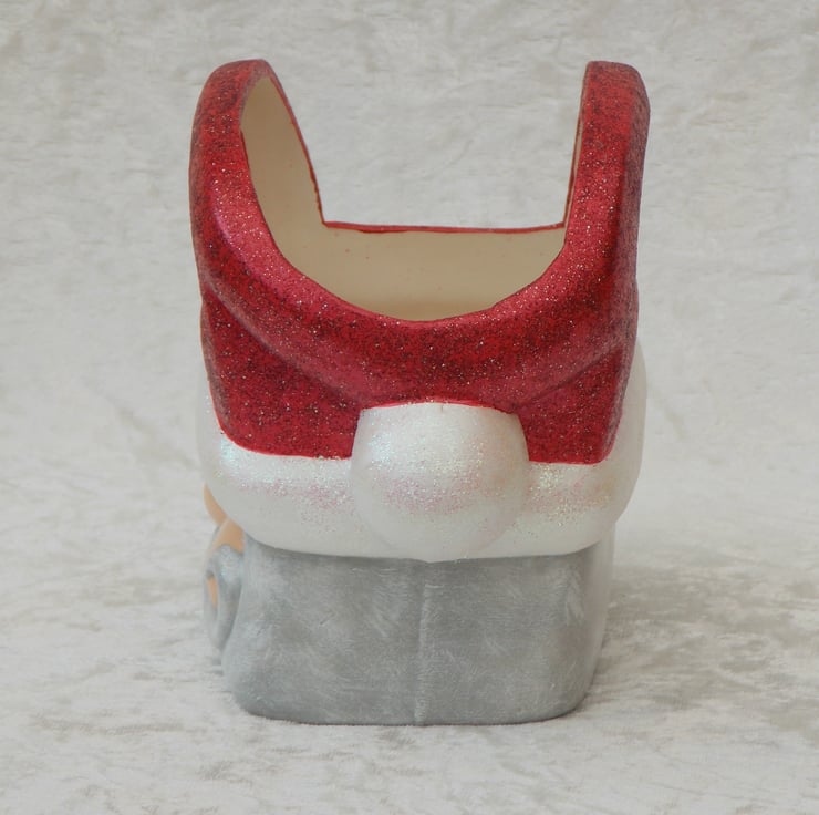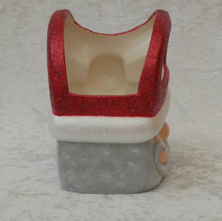I have for sale a ceramic Christmas decoration, which was hand painted by myself. It is a Father Christmas/Santa gift bag, with the bottom half of the bag, as the face and the top part, the red and white hat, which is glittery. The whole item is hollow, which could be filled with small Christmas gifts or perhaps some decorative foliage, baubles or even a battery operated candle, to make a lovely Christmas table decoration. This would make a lovely addition to anyone's Christmas decorations, or perhaps given as a gift.
