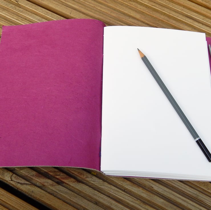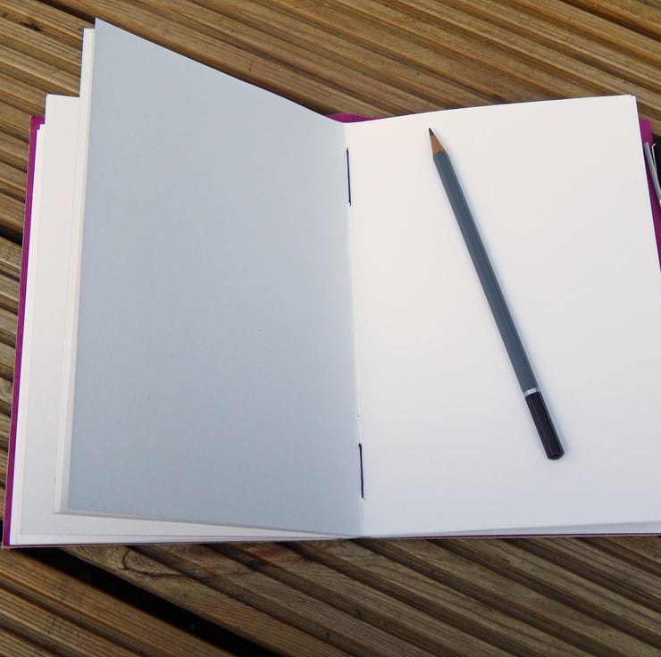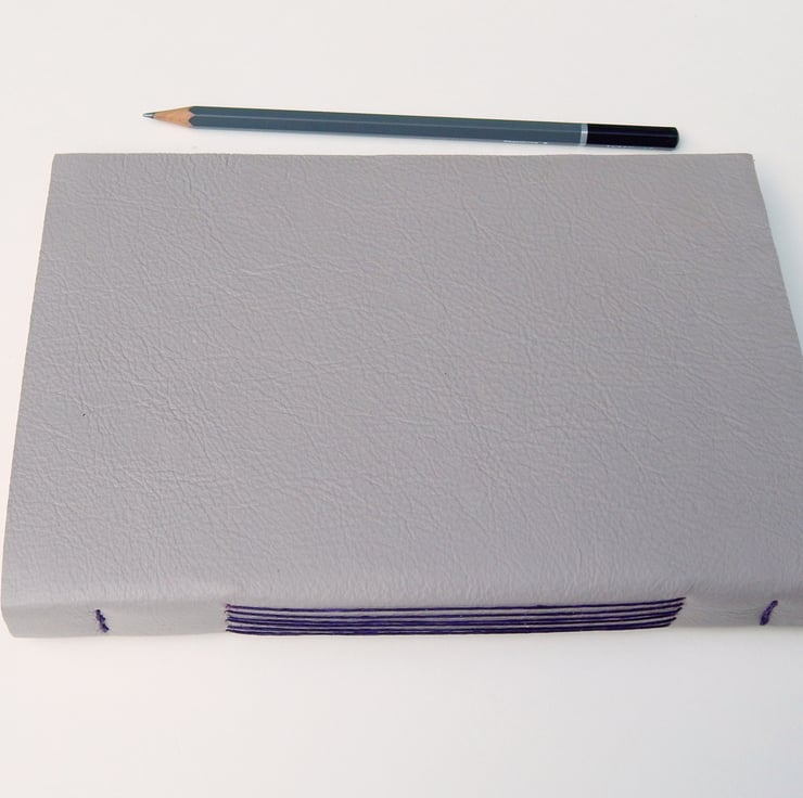 High quality leather cover in soft grey, lined with magenta-purple mulberry paper.