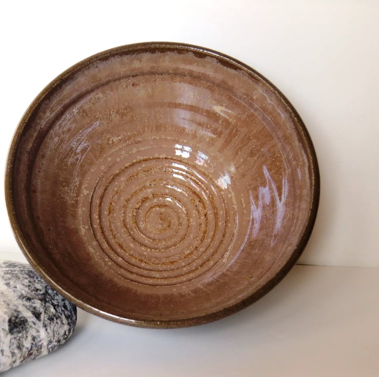 I threw this bowl on the potters wheel using a strong stoneware clay. I then added the detailed spiral that sits inside the bowl and turned the base to make a foot ring. It was then fired to a bisque before being glazed in three contrasting and complimentary glazes and refired to 1220C.