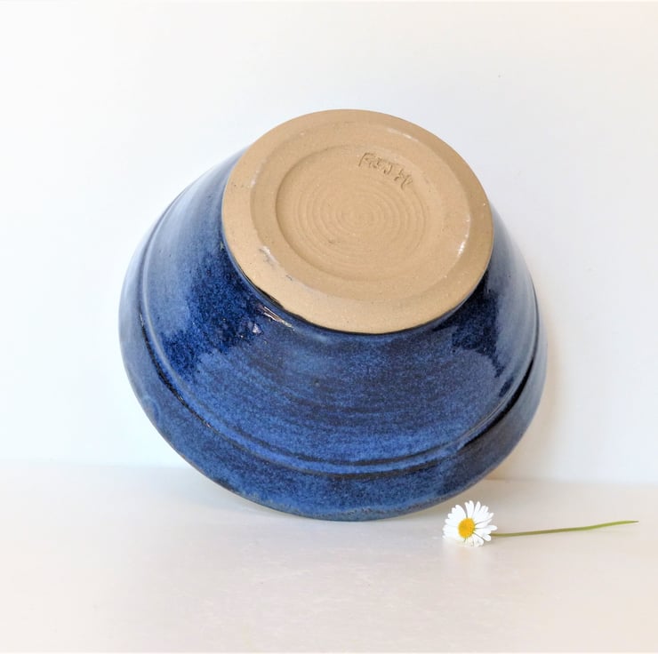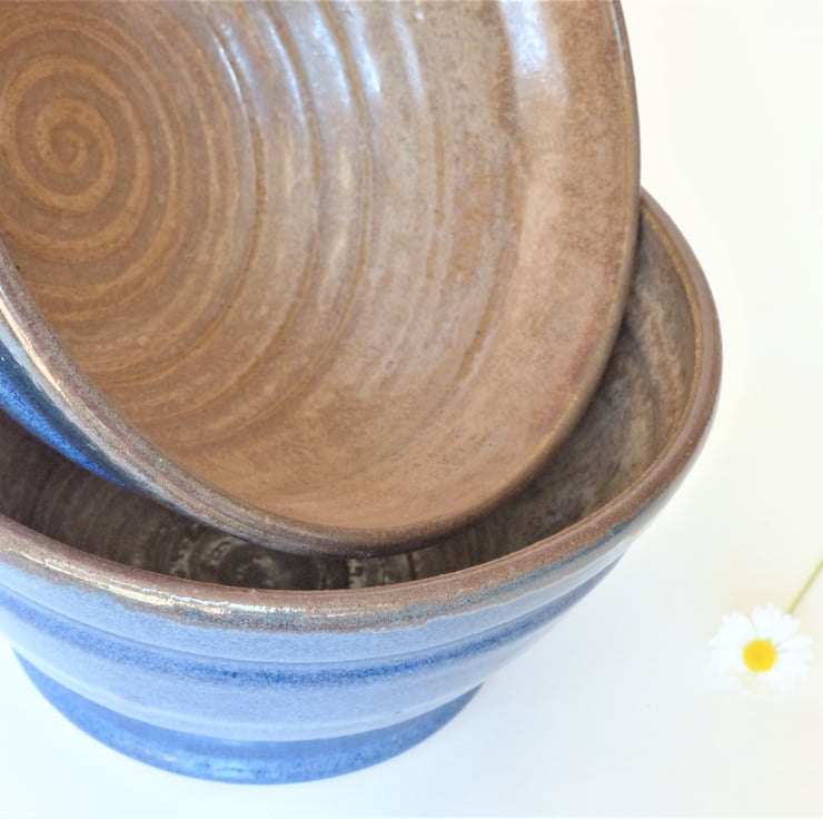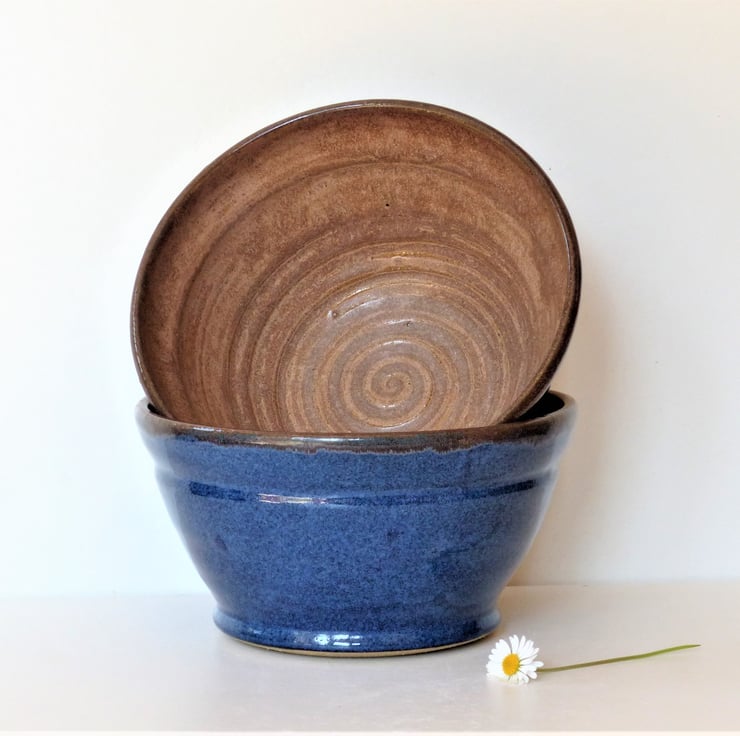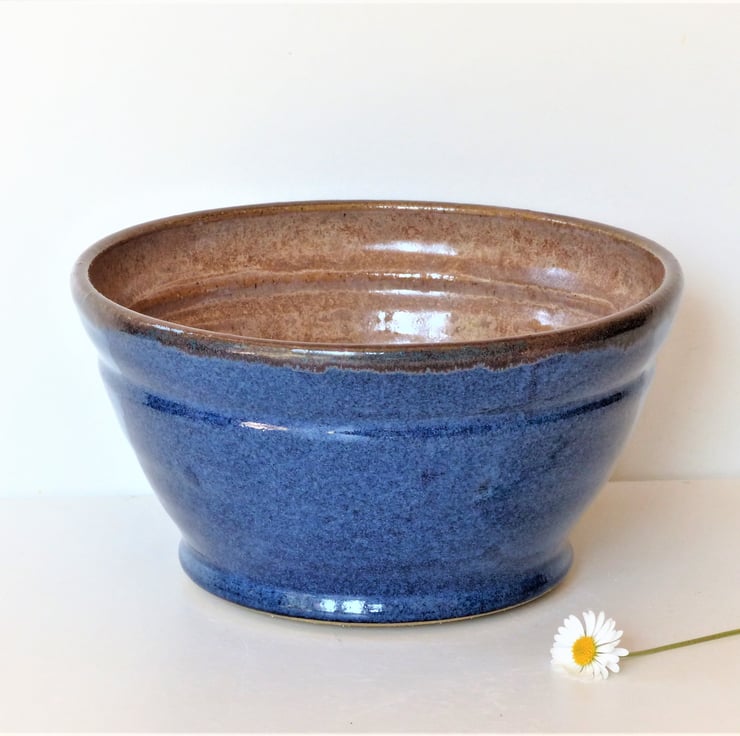 The colours in this bowl include on the inside a rich mixture of coffees and fawn, the rim an olive green, and the outside a rich blue.