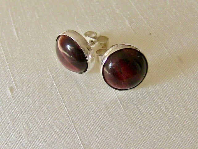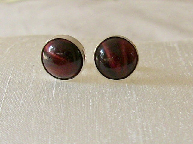 These silver stud earrings feature exotic red tiger's eye cabochons. Tiger's eye displays chatoyancy, or cat's eye effect - an optical reflection which arises from microscopic fibres within the stone. In this case you can see two bright lines in each stone, which appear to move around with the angle of view.