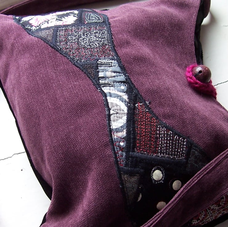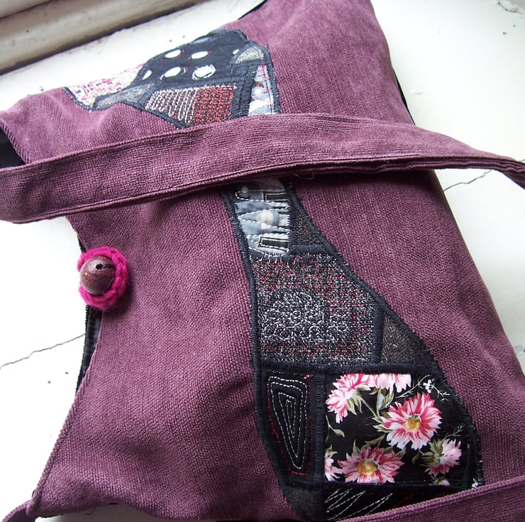 Front and strap are made from mulberry coloured plain fabric with a line texture - very like a teeny weeny corduroy. Appliqued over the front is a curved panel with patches and machine embroidery in blacks, pinks and greys. Bag of bag is black velvet. Bag fastens with a yarn loop and a wooden bead.