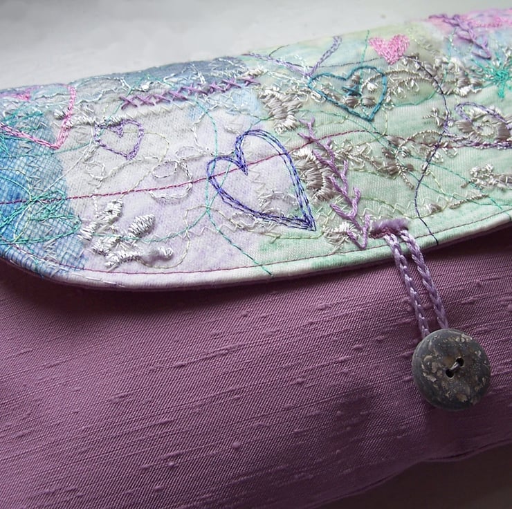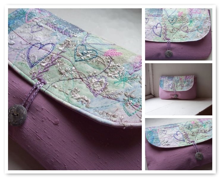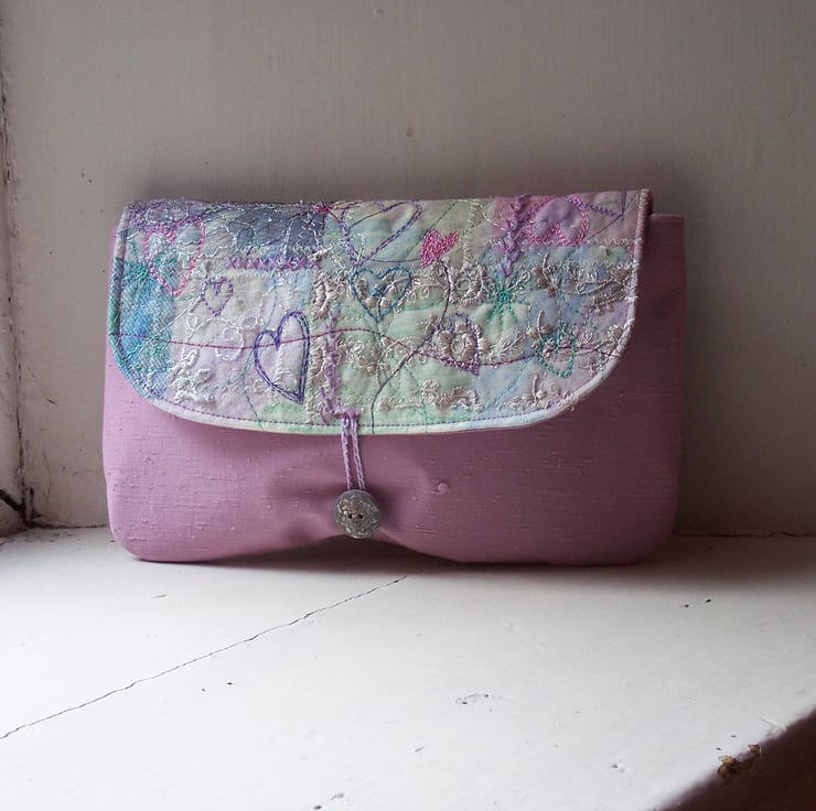 Myrtle fabric clutch bag with patchwork and embroidered flap. Perfect for a bridesmaid gift.