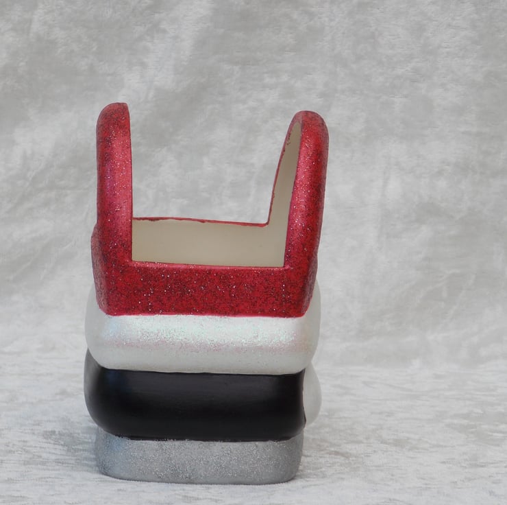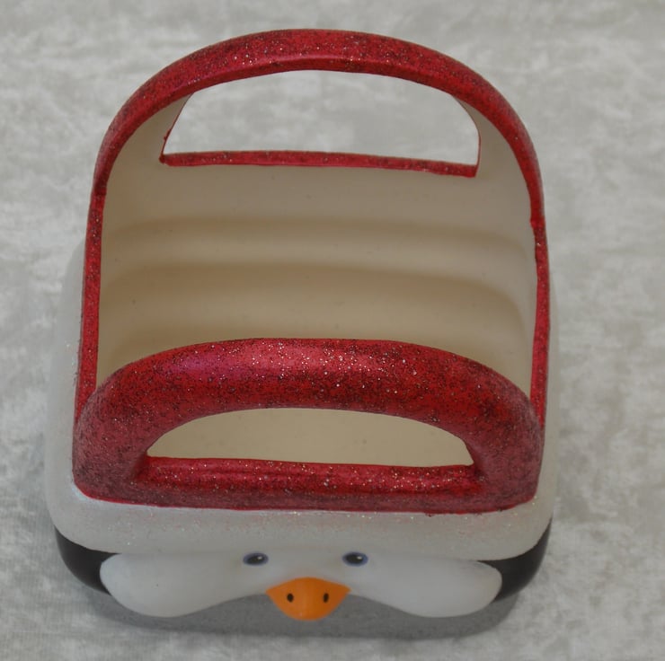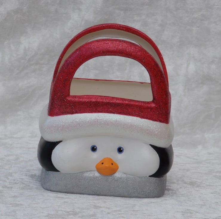 I have for sale a ceramic Christmas decoration, which was hand painted by myself. It is a Christmas gift bag, in the shape of a penguin's head, wearing a Christmas, red and white glittery hat. The bottom of the bag, looks like a silver coloured, glittery scarf, wrapped around the penguin. The whole item is hollow, which could be filled with some small Christmas gifts or perhaps some decorative foliage, baubles or even add a battery operated candle, to make a lovely Christmas table decoration. This would make a lovely addition to anyone's Christmas decorations, or perhaps fill it with a small present and give it as a gift.