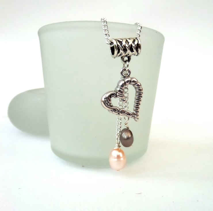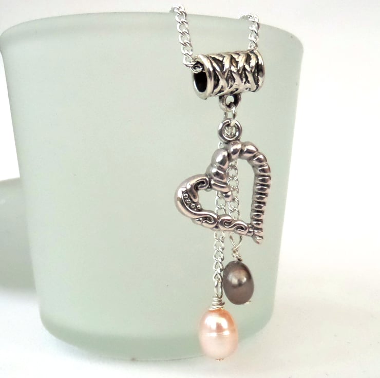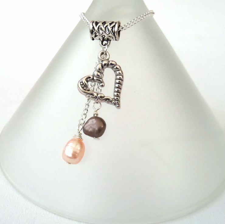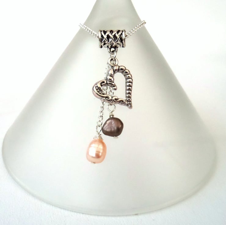 Individual peach and brown pearls hang with an ornate tibetan silver heart charm to make this delicate charm cluster necklace.