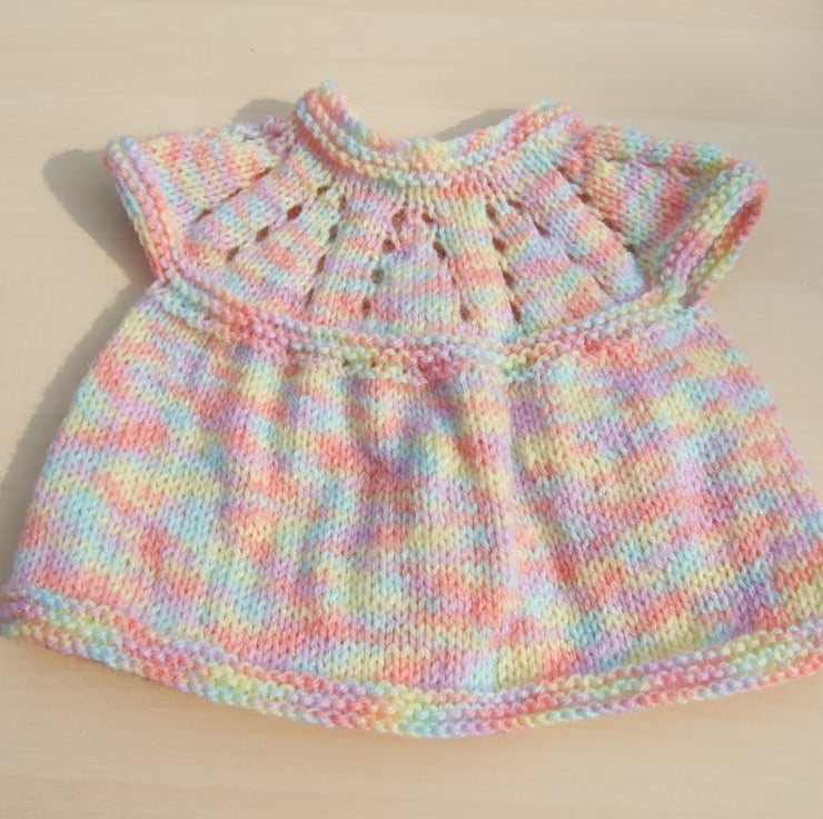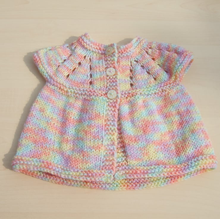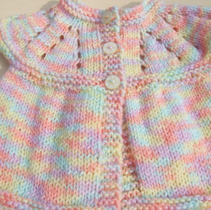 This cute little sleeveless cardigan or top have been hand knitted using a lovely yarn called nursery which is a mixture of pastel colours including lemon, peach and pale green. It has cap sleeves which just cover the shoulder and a pretty eyelet pattern to the yoke. It fastens down the chest with three button. Would be great for additional warmth over the top of a baby grow.