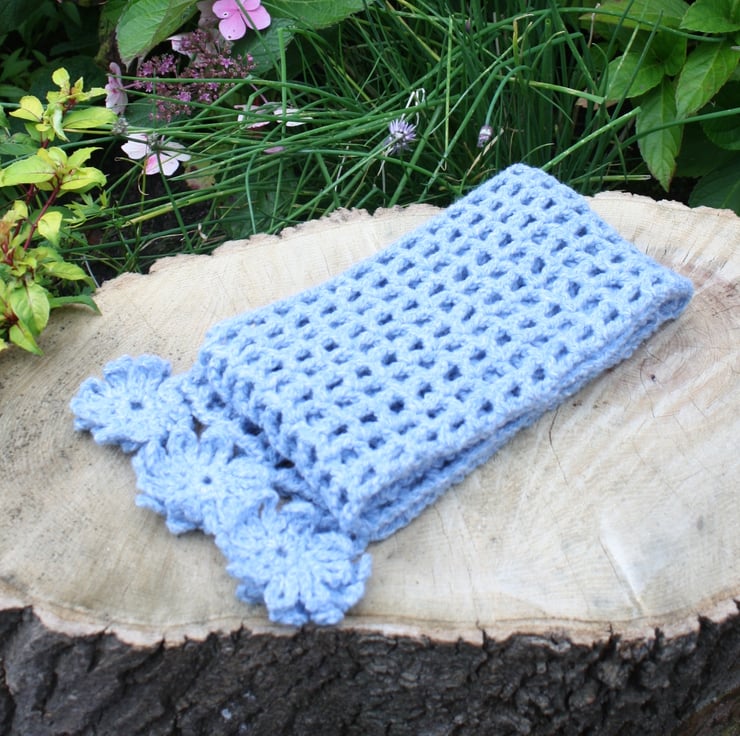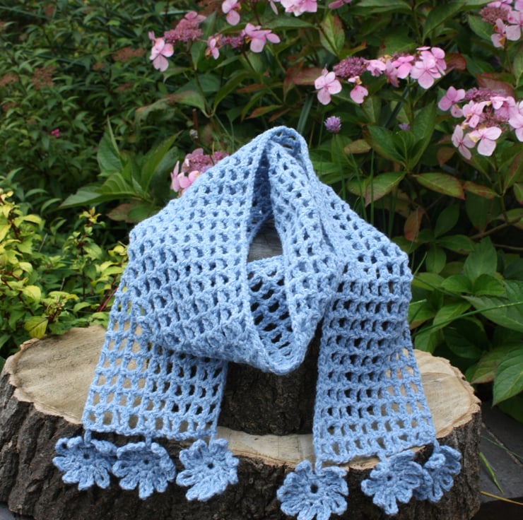 Light and airy hand crocheted scarf with crocheted flowers attached. Made with acrylic aran yarn. Measures approx 150cm x 14cm. Perfect for cool autumn mornings and sunny spring days.