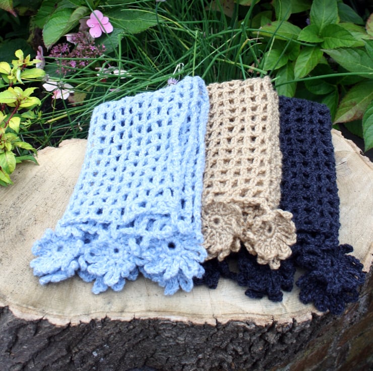 Light and airy hand crocheted scarf with crocheted flowers attached. Made with chunky yarn 60% acrylic, 25% cotton and 15% wool. Measures approx 160cm x 15cm. Perfect for cool autumn days and sunny spring sunshine.