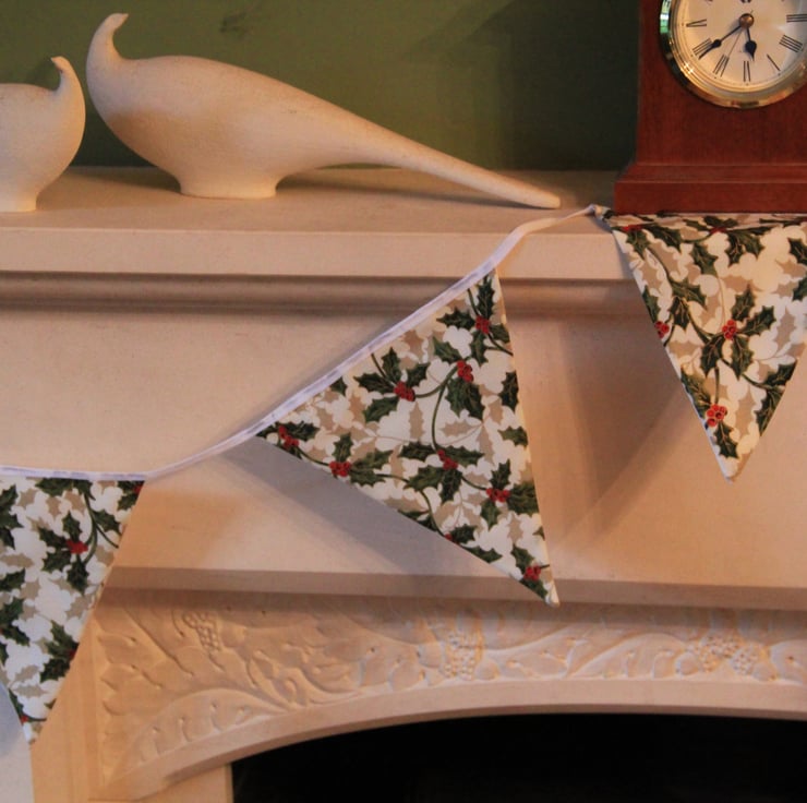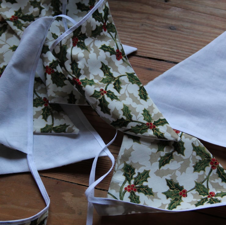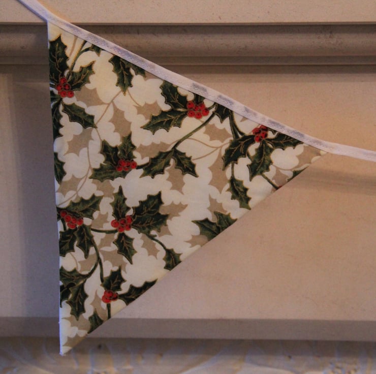 Lovely large Christmas bunting, made from green, red and gold holly printed cotton fabric lined with snowy white cotton on the reverse and stitched onto white tape. Nine flags, each measuring 19cm width and 20cm length. Total flagged length measures approximately 2.3 metres, with plenty of tape each end for tying.