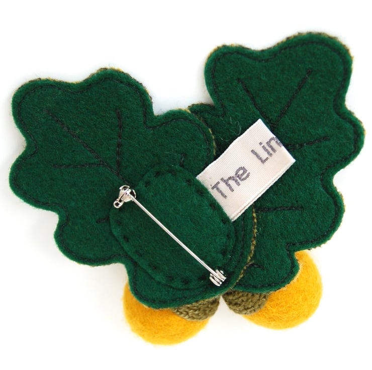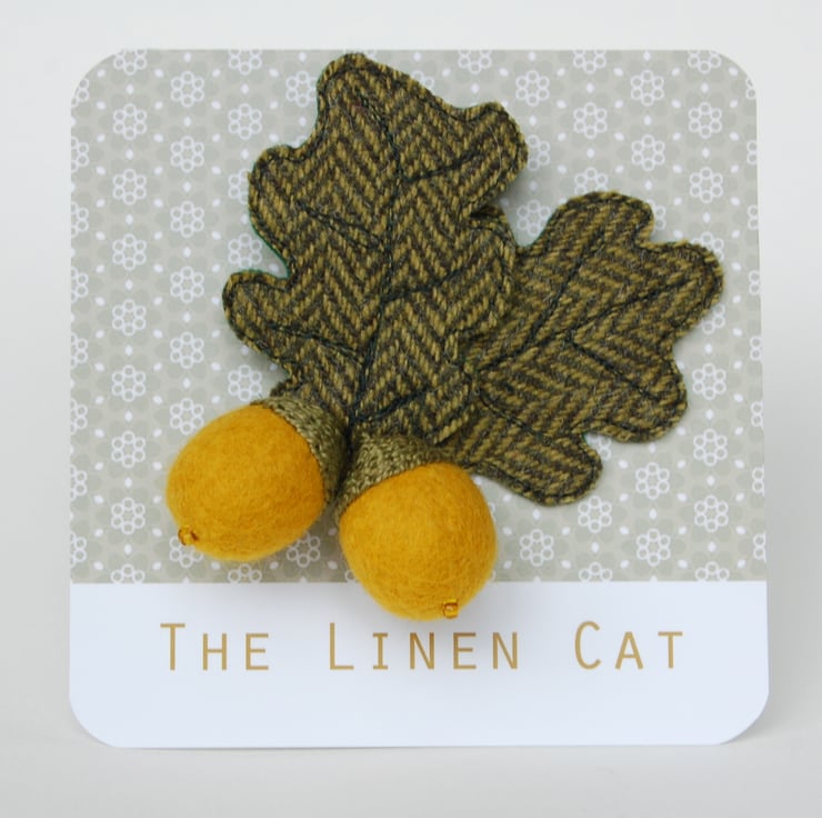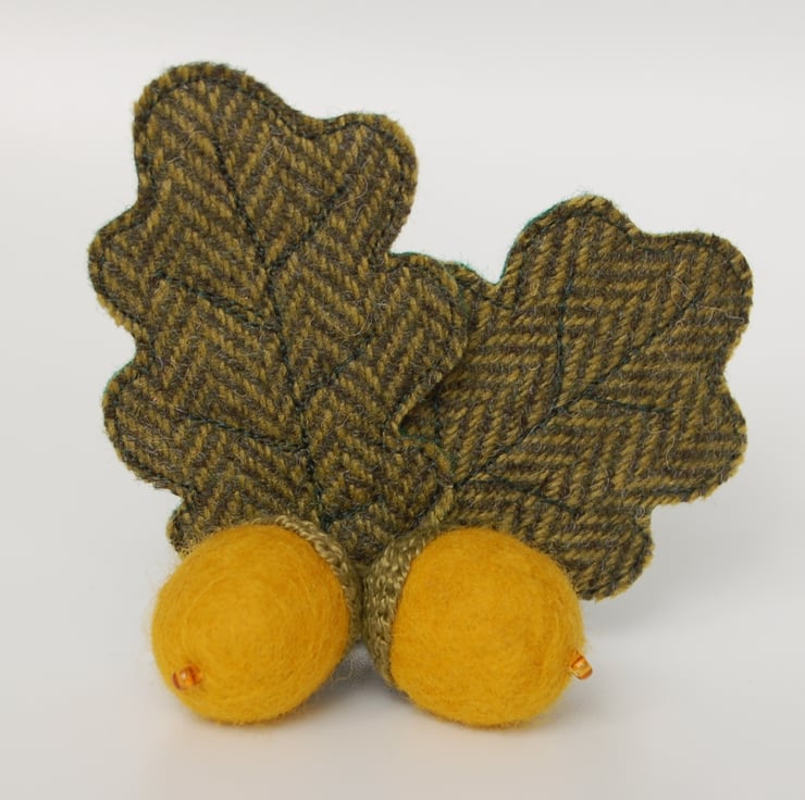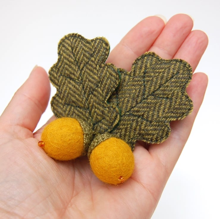A sweet little Autumn Acorn Brooch, made from a hand felted mustard wool ball, with a glass bead and embroidered cup (this bit take forever! hence this only being the second batch I've made of acorns, despite their popularity). Leaves are stitched in free-motion machine embroidery, on green tweed. The brooch has a neatly attached brooch pin on the back.